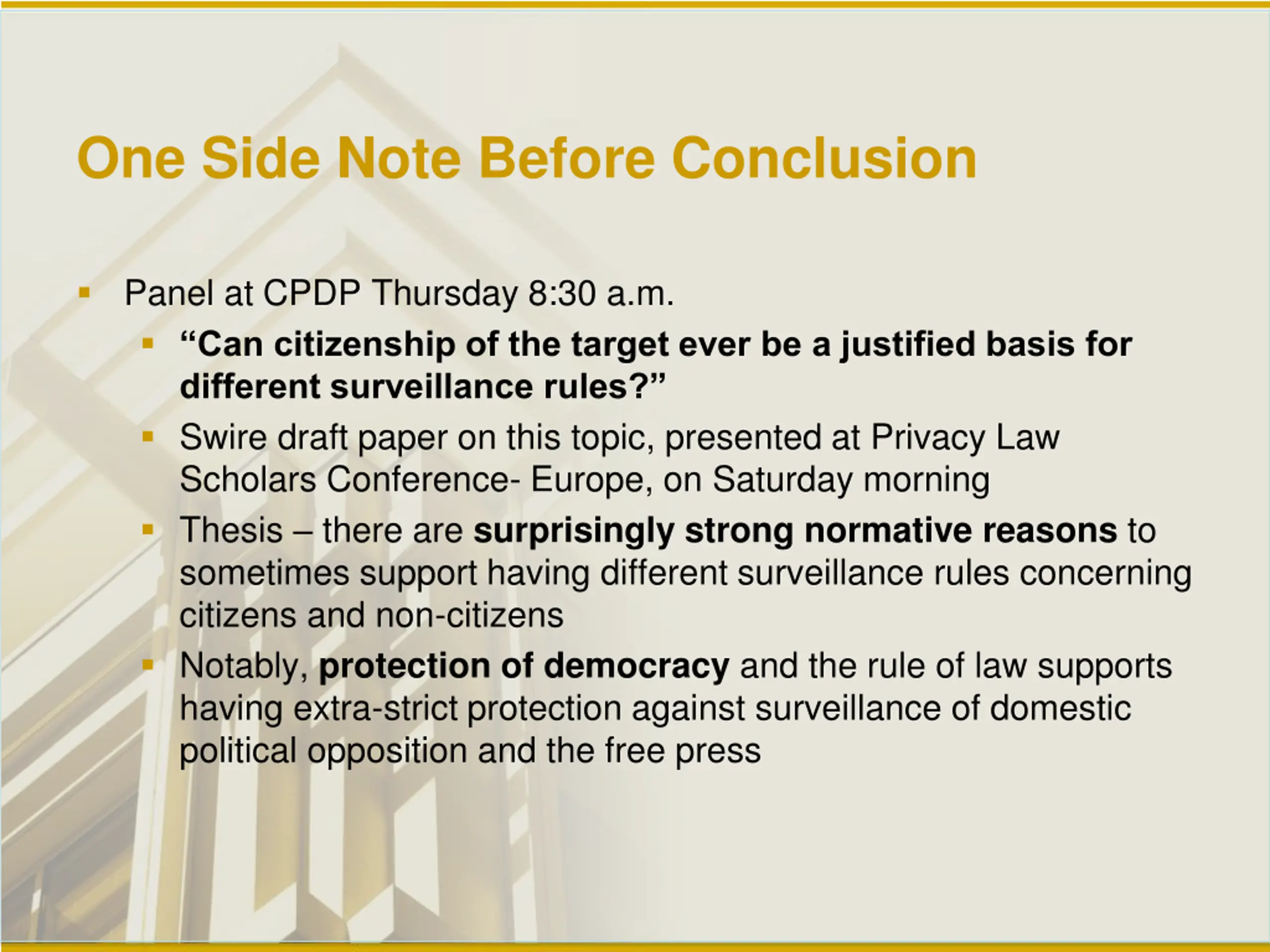 One Side Note Before Conclusion Panel at CPDP Thursday 8:30 a.m. Can citizenship of the target ever be a justified basis for different surveillance rules? Swire draft paper on this topic, presented at Privacy Law Scholars Conference- Europe, on Saturday morning Thesis there are surprisingly strong normative reasons to sometimes support having different surveillance rules concerning citizens and non-citizens Notably, protection of democracy and the rule of law supports having extra-strict protection against surveillance of domestic political opposition and the free press