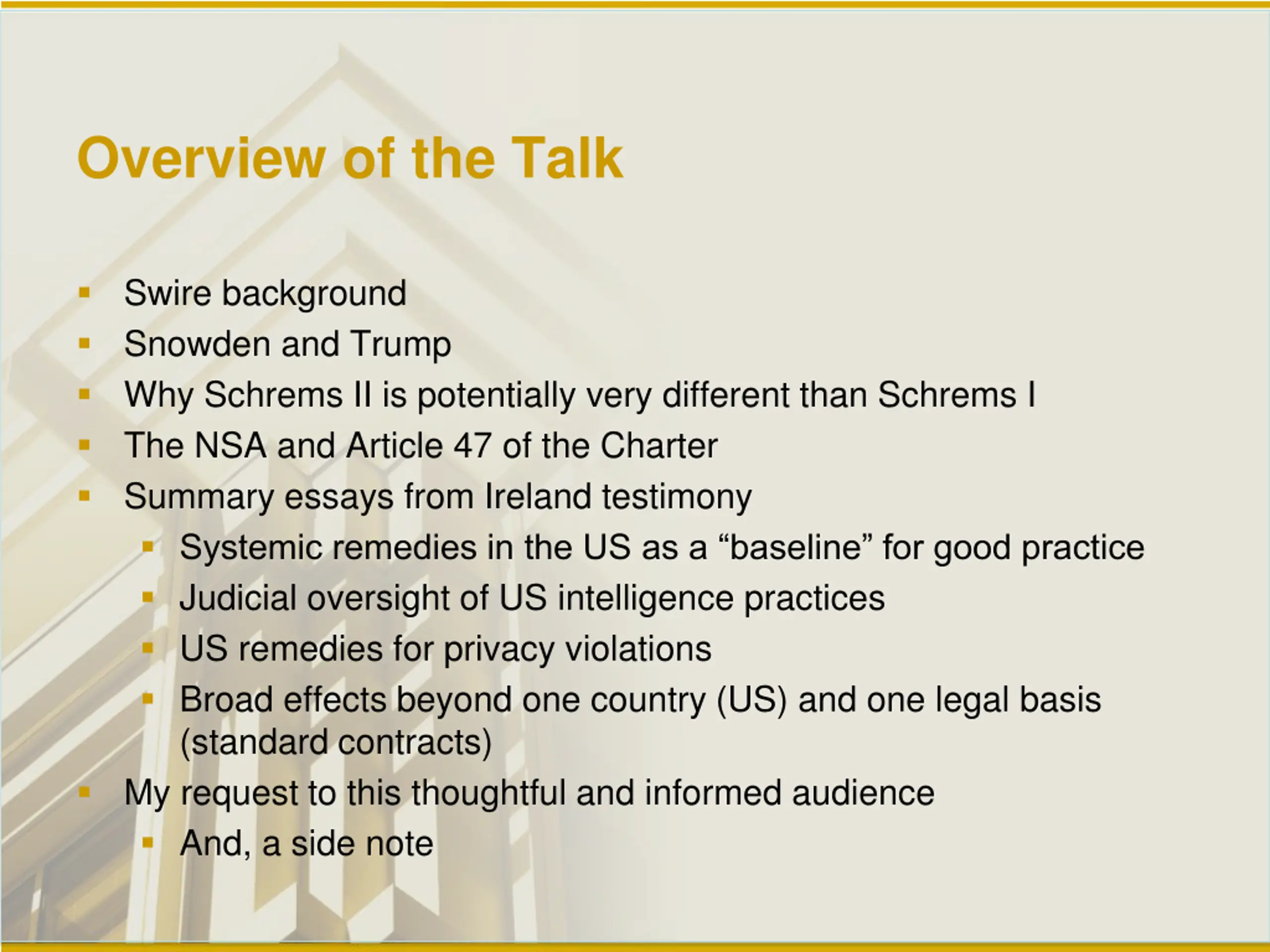 Overview of the Talk Swire background Snowden and Trump Why Schrems II is potentially very different than Schrems I The NSA and Article 47 of the Charter Summary essays from Ireland testimony Systemic remedies in the US as a baseline for good practice Judicial oversight of US intelligence practices US remedies for privacy violations Broad effects beyond one country (US) and one legal basis (standard contracts) My request to this thoughtful and informed audience And, a side note