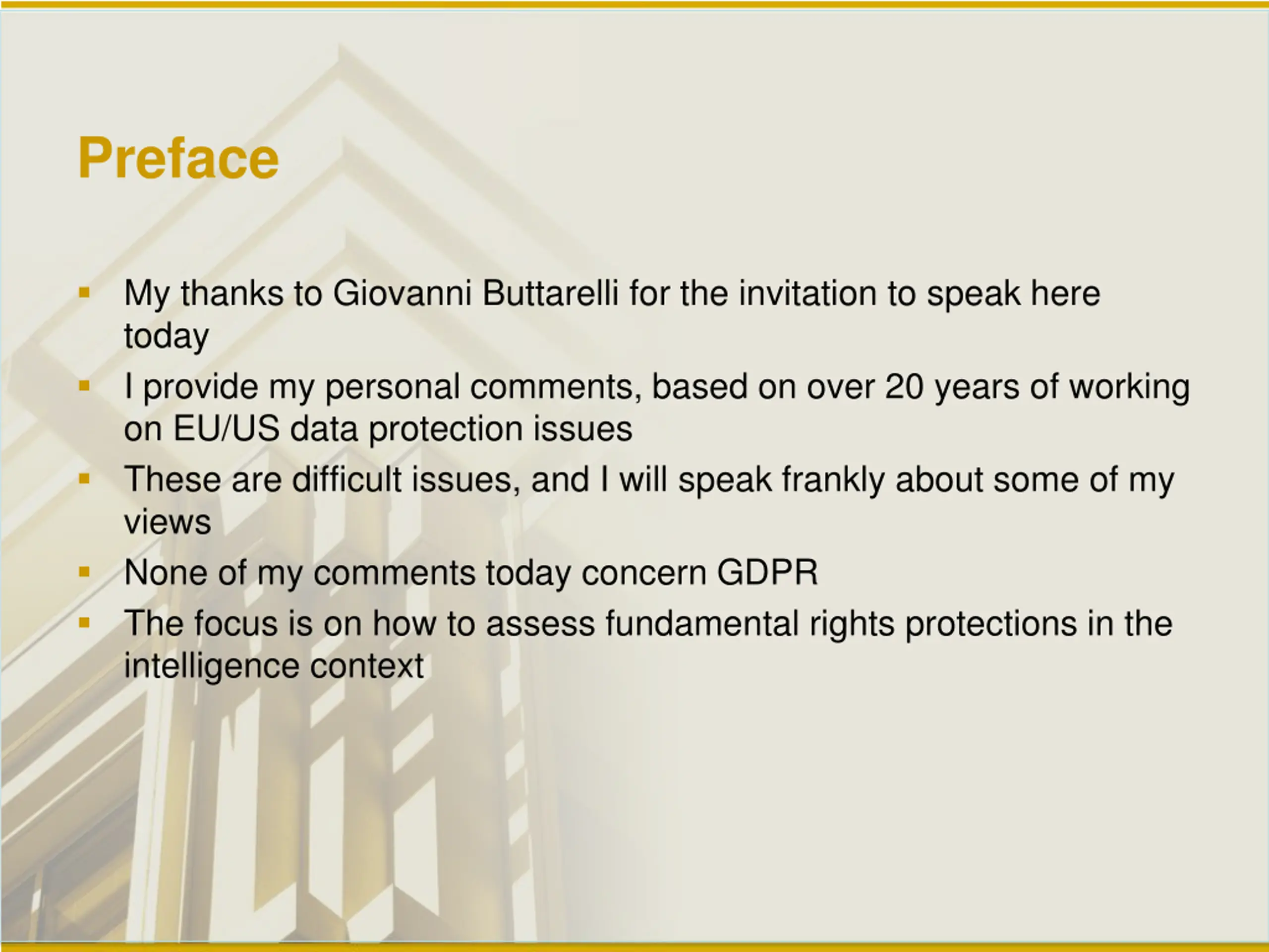 Preface My thanks to Giovanni Buttarelli for the invitation to speak here today I provide my personal comments, based on over 20 years of working on EU/US data protection issues These are difficult issues, and I will speak frankly about some of my views None of my comments today concern GDPR The focus is on how to assess fundamental rights protections in the intelligence context