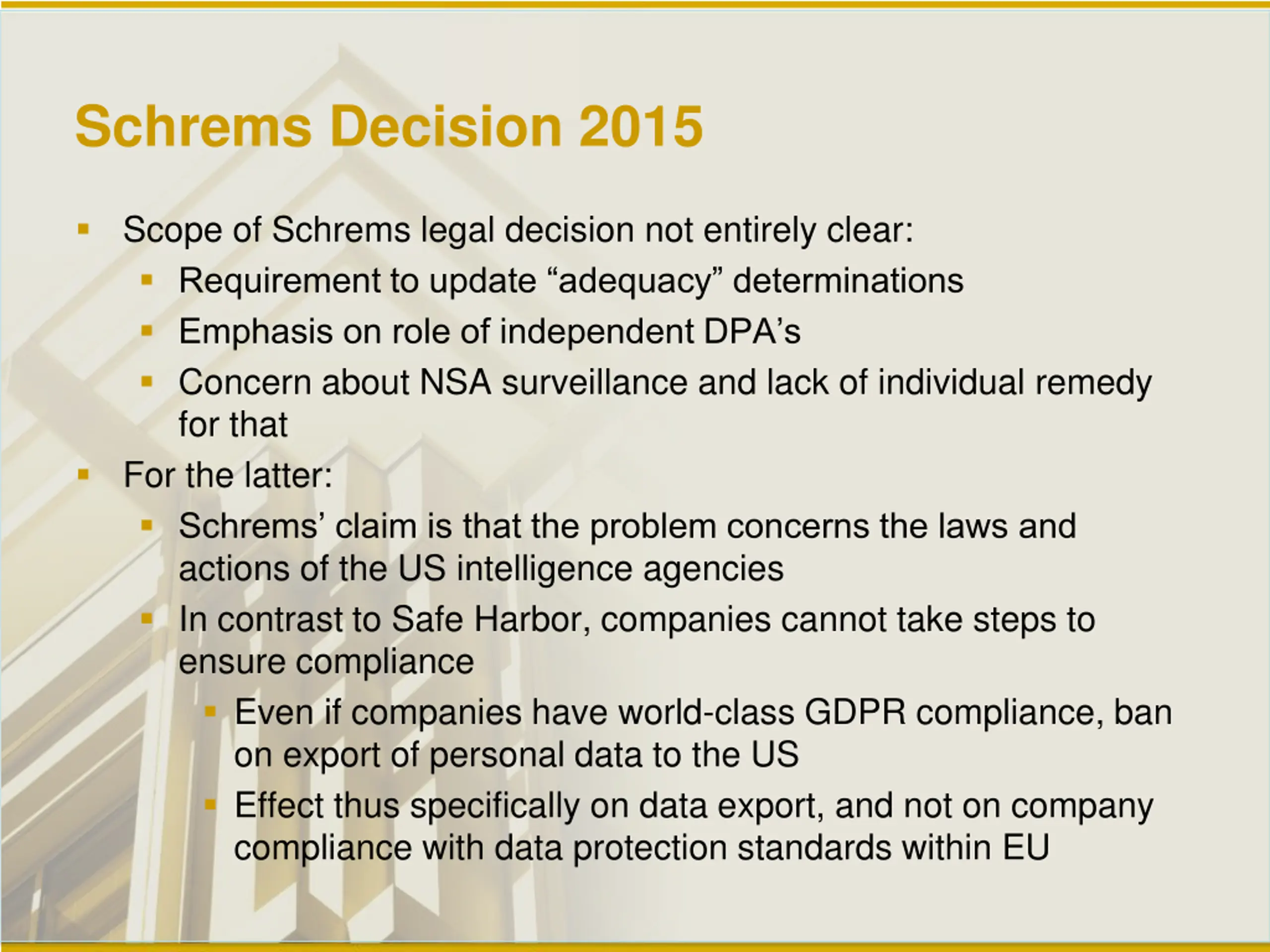 Schrems Decision 2015 Scope of Schrems legal decision not entirely clear: Requirement to update adequacy determinations Emphasis on role of independent DPA s Concern about NSA surveillance and lack of individual remedy for that For the latter: Schrems claim is that the problem concerns the laws and actions of the US intelligence agencies In contrast to Safe Harbor, companies cannot take steps to ensure compliance Even if companies have world-class GDPR compliance, ban on export of personal data to the US Effect thus specifically on data export, and not on company compliance with data protection standards within EU