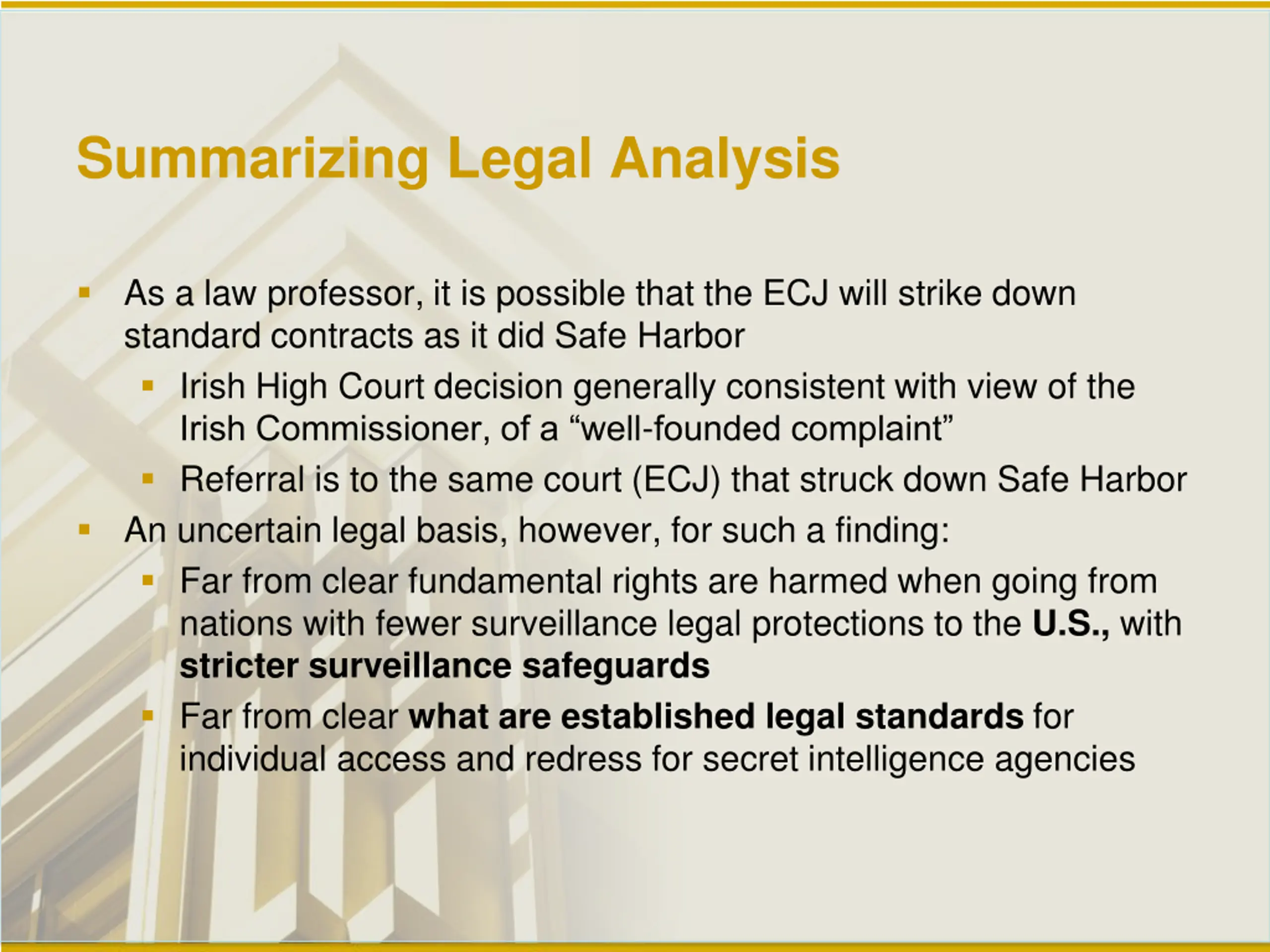 Summarizing Legal Analysis As a law professor, it is possible that the ECJ will strike down standard contracts as it did Safe Harbor Irish High Court decision generally consistent with view of the Irish Commissioner, of a well-founded complaint Referral is to the same court (ECJ) that struck down Safe Harbor An uncertain legal basis, however, for such a finding: Far from clear fundamental rights are harmed when going from nations with fewer surveillance legal protections to the U.S., with stricter surveillance safeguards Far from clear what are established legal standards for individual access and redress for secret intelligence agencies
