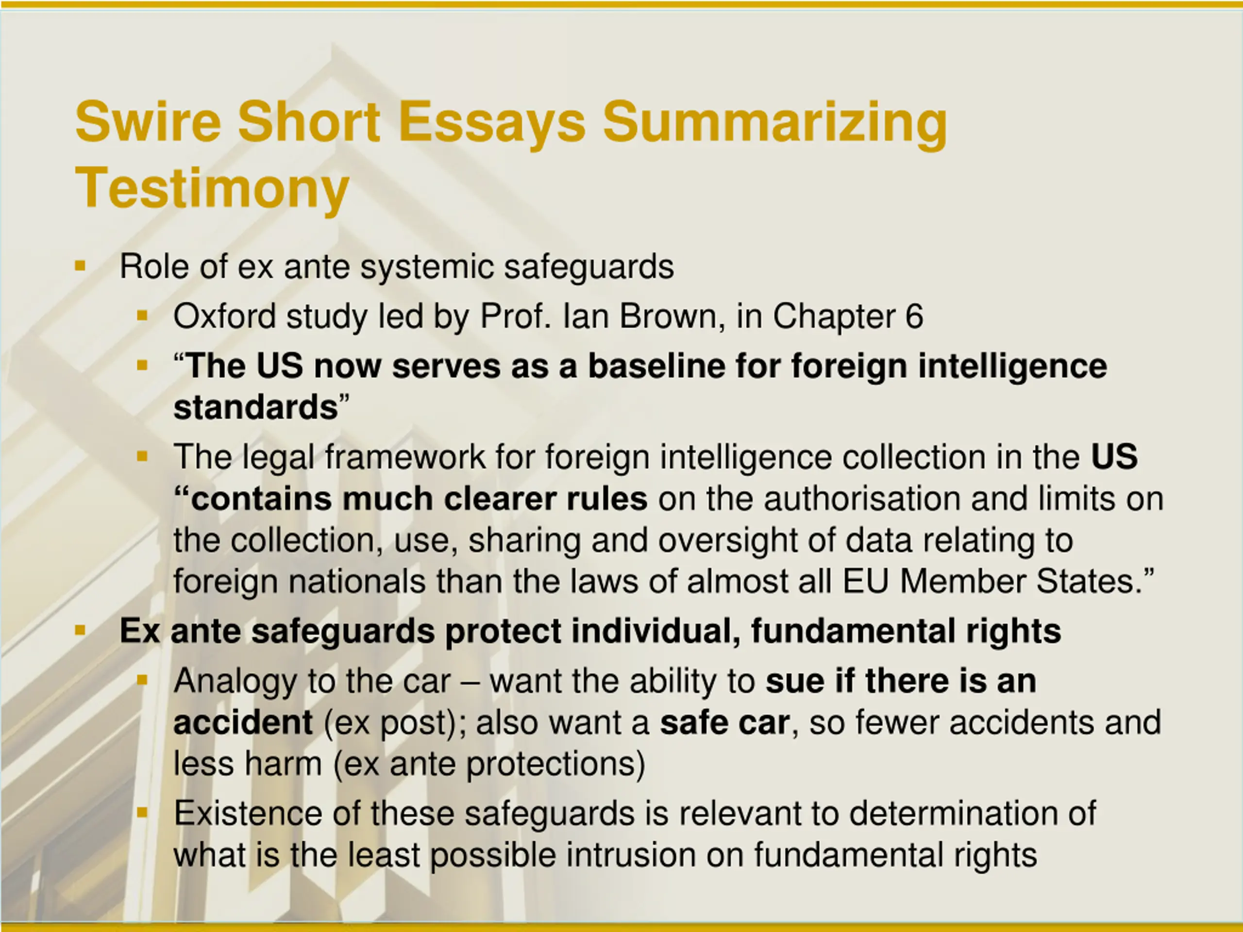 Swire Short Essays Summarizing Testimony Role of ex ante systemic safeguards Oxford study led by Prof. Ian Brown, in Chapter 6 The US now serves as a baseline for foreign intelligence standards The legal framework for foreign intelligence collection in the US contains much clearer rules on the authorisation and limits on the collection, use, sharing and oversight of data relating to foreign nationals than the laws of almost all EU Member States. Ex ante safeguards protect individual, fundamental rights Analogy to the car want the ability to sue if there is an accident (ex post); also want a safe car, so fewer accidents and less harm (ex ante protections) Existence of these safeguards is relevant to determination of what is the least possible intrusion on fundamental rights