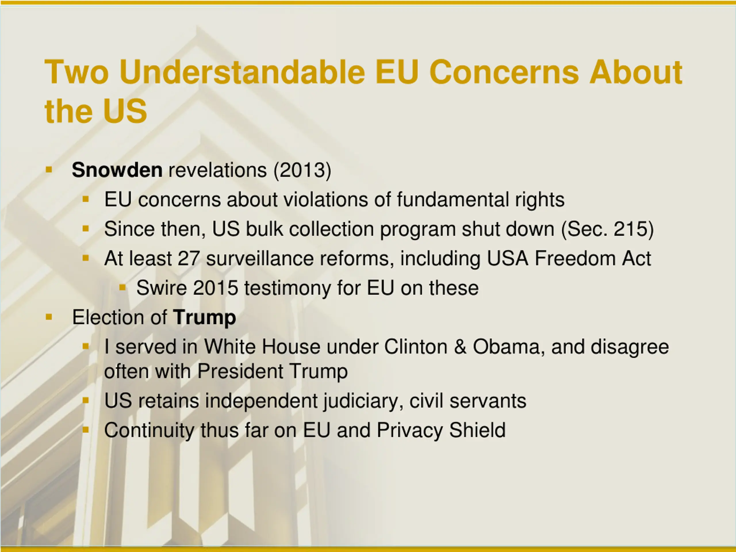 Two Understandable EU Concerns About the US Snowden revelations (2013) EU concerns about violations of fundamental rights Since then, US bulk collection program shut down (Sec. 215) At least 27 surveillance reforms, including USA Freedom Act Swire 2015 testimony for EU on these Election of Trump I served in White House under Clinton & Obama, and disagree often with President Trump US retains independent judiciary, civil servants Continuity thus far on EU and Privacy Shield