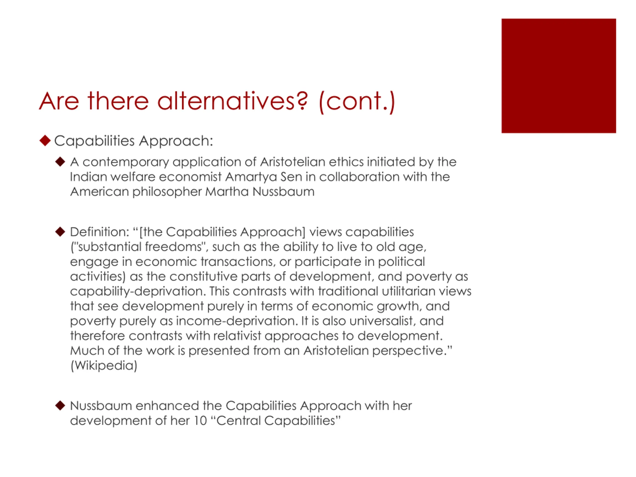 Are there alternatives? (cont.) Capabilities Approach: A contemporary application of Aristotelian ethics initiated by the Indian welfare economist Amartya Sen in collaboration with the American philosopher Martha Nussbaum Definition: [the Capabilities Approach] views capabilities ("substantial freedoms", such as the ability to live to old age, engage in economic transactions, or participate in political activities) as the constitutive parts of development, and poverty as capability-deprivation. This contrasts with traditional utilitarian views that see development purely in terms of economic growth, and poverty purely as income-deprivation. It is also universalist, and therefore contrasts with relativist approaches to development. Much of the work is presented from an Aristotelian perspective. (Wikipedia) Nussbaum enhanced the Capabilities Approach with her development of her 10 Central Capabilities