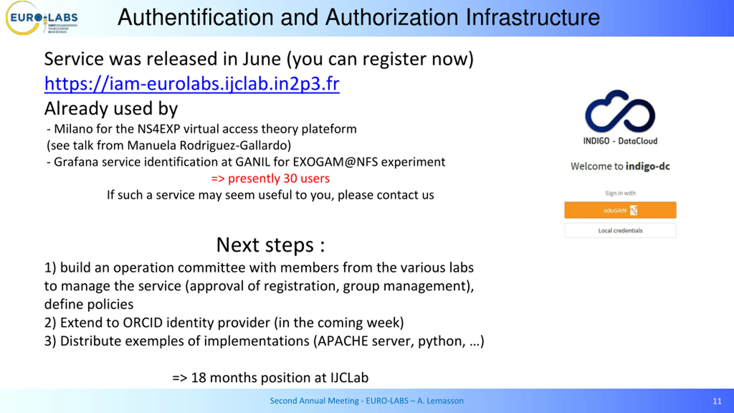 Authentification and Authorization Infrastructure Task 3.1 (M. Jouvin IJCLab) Common identification and authentification service Identification using existing federations (eduGAIN, ) using single sign on (SSO) or ORCID Easy registration of new services (compared to registration directly to the federation) Management of users based on groups to handle/differenrtian authorizations levels on the service side Benefiting from the experience gained from ESCAPE => INDIGO IAM Second Annual Meeting - EURO-LABS A. Lemasson 10