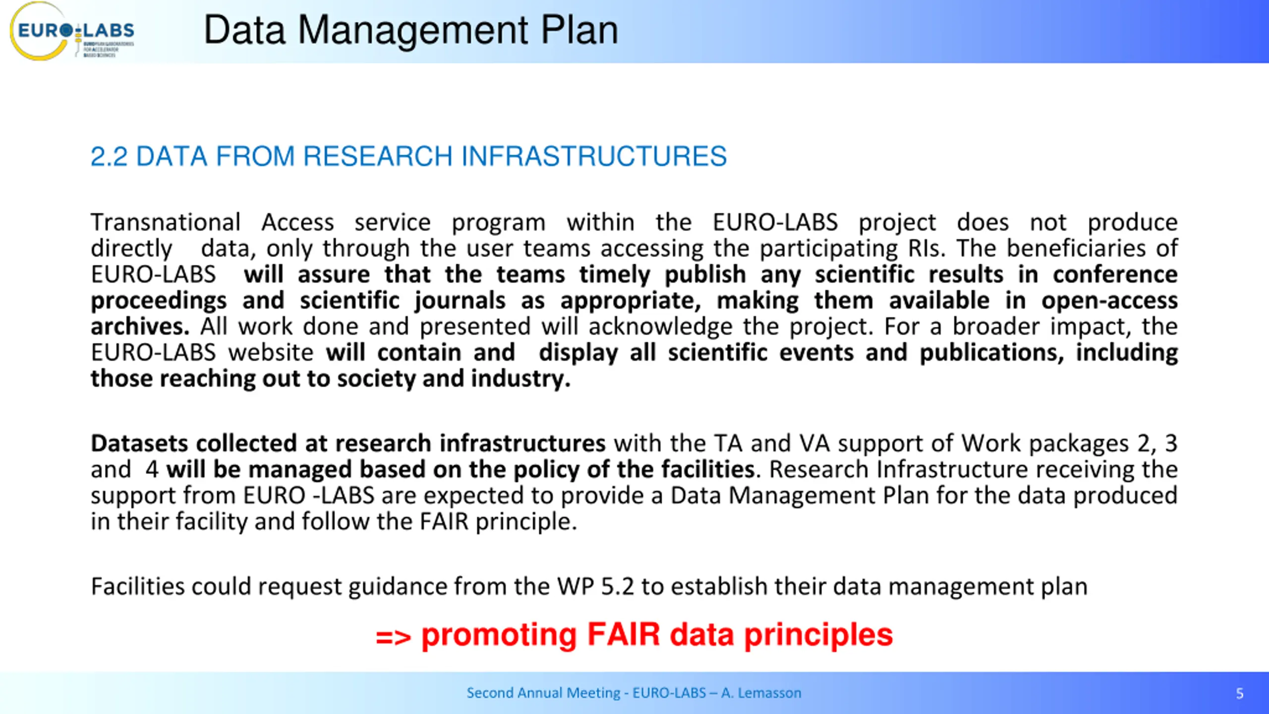 Data Management Plan 2.2 DATA FROM RESEARCH INFRASTRUCTURES Transnational Access service program within the EURO-LABS project does not produce directly data, only through the user teams accessing the participating RIs. The beneficiaries of EURO-LABS will assure that the teams timely publish any scientific results in conference proceedings and scientific journals as appropriate, making them available in open-access archives. All work done and presented will acknowledge the project. For a broader impact, the EURO-LABS website will contain and display all scientific events and publications, including those reaching out to society and industry. Datasets collected at research infrastructures with the TA and VA support of Work packages 2, 3 and 4 will be managed based on the policy of the facilities. Research Infrastructure receiving the support from EURO -LABS are expected to provide a Data Management Plan for the data produced in their facility and follow the FAIR principle. Facilities could request guidance from the WP 5.2 to establish their data management plan => promoting FAIR data principles Second Annual Meeting - EURO-LABS A. Lemasson 5