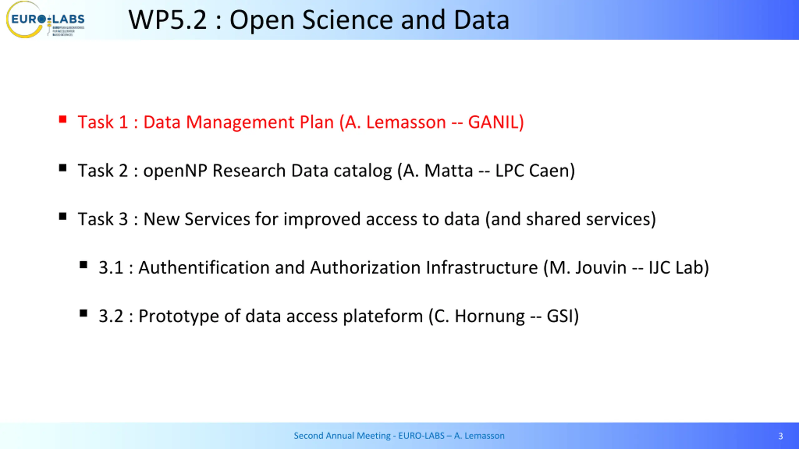 WP5.2 : Open Science and Data Task 1 : Data Management Plan (A. Lemasson -- GANIL) Task 2 : openNP Research Data catalog (A. Matta -- LPC Caen) Task 3 : New Services for improved access to data (and shared services) 3.1 : Authentification and Authorization Infrastructure (M. Jouvin -- IJC Lab) 3.2 : Prototype of data access plateform (C. Hornung -- GSI) Second Annual Meeting - EURO-LABS A. Lemasson 3