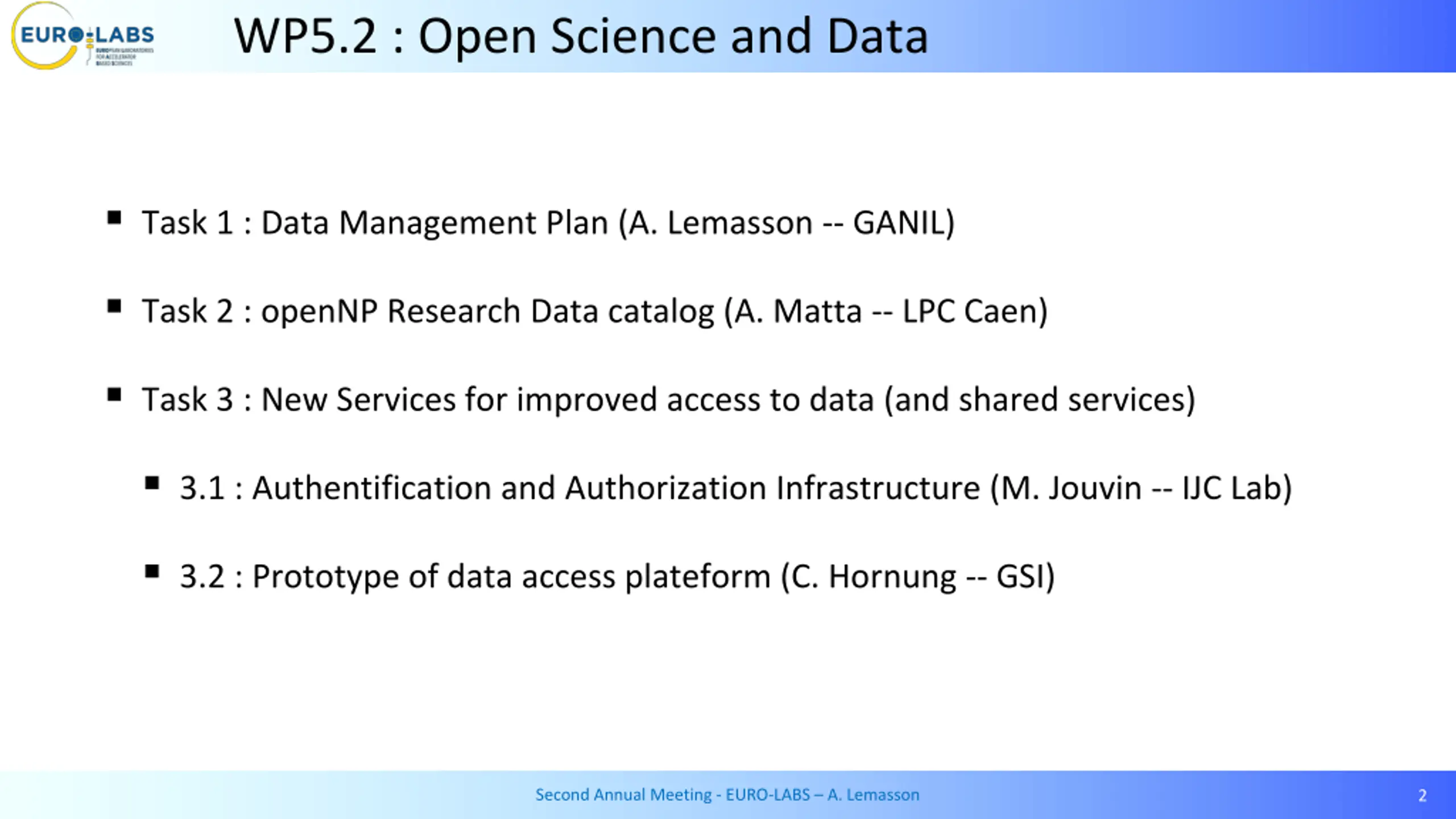 WP5.2 : Open Science and Data Task 1 : Data Management Plan (A. Lemasson -- GANIL) Task 2 : openNP Research Data catalog (A. Matta -- LPC Caen) Task 3 : New Services for improved access to data (and shared services) 3.1 : Authentification and Authorization Infrastructure (M. Jouvin -- IJC Lab) 3.2 : Prototype of data access plateform (C. Hornung -- GSI) Second Annual Meeting - EURO-LABS A. Lemasson 2