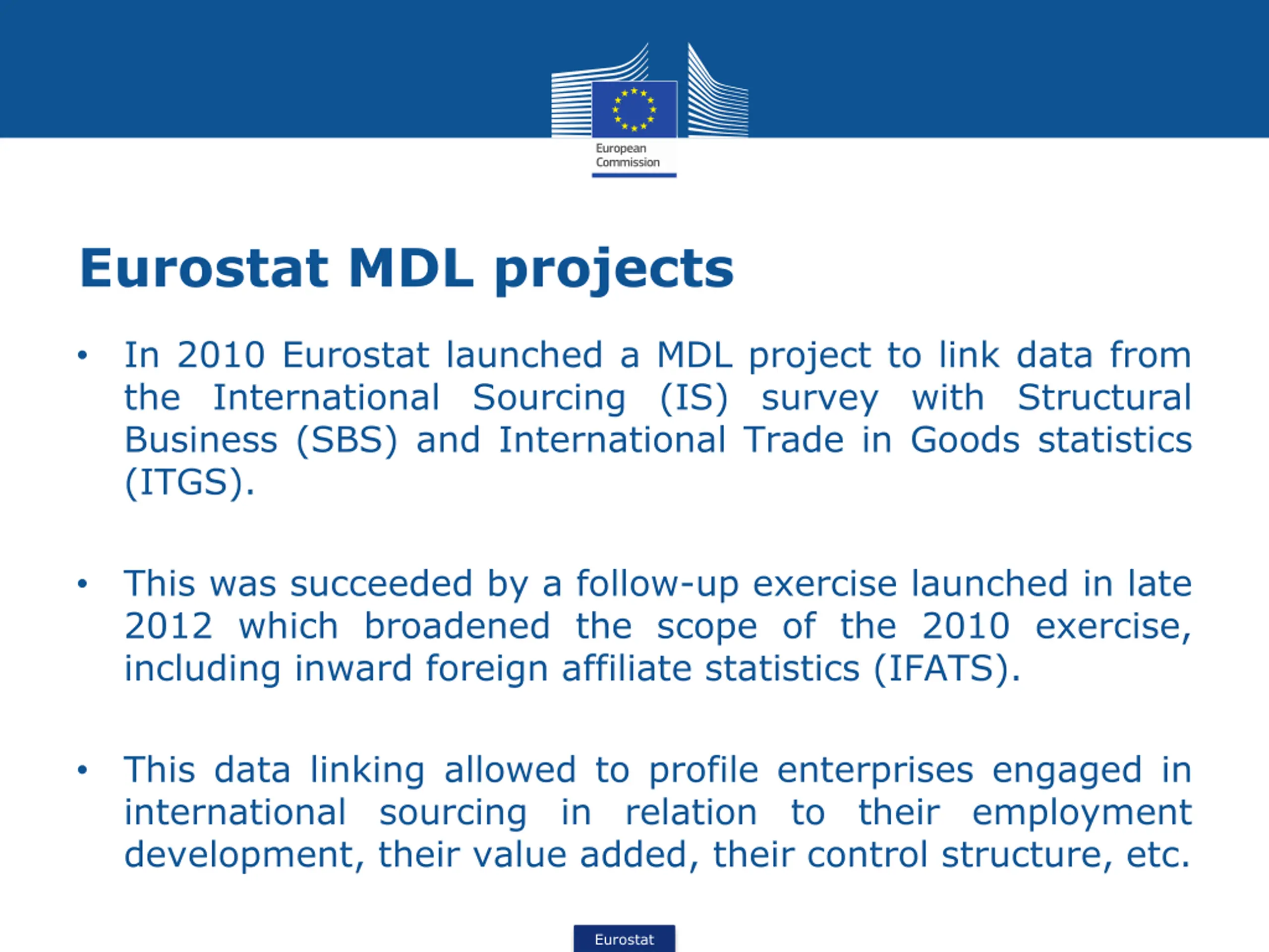 Eurostat MDL projects In 2010 Eurostat launched a MDL project to link data from the International Sourcing (IS) survey with Structural Business (SBS) and International Trade in Goods statistics (ITGS). This was succeeded by a follow-up exercise launched in late 2012 which broadened the scope of the 2010 exercise, including inward foreign affiliate statistics (IFATS). This data linking allowed to profile enterprises engaged in international sourcing in relation development, their value added, their control structure, etc. to their employment Eurostat