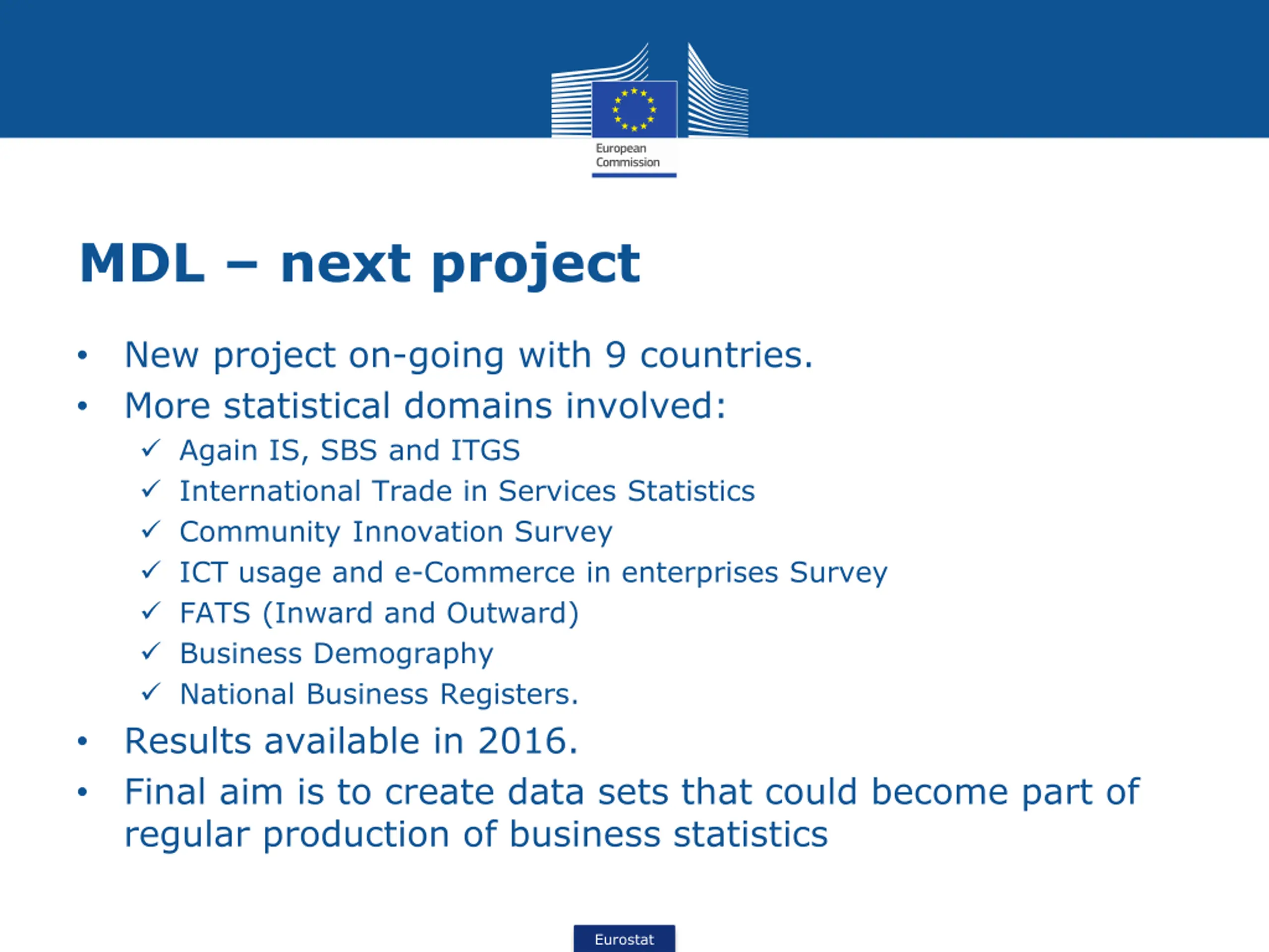 MDL next project New project on-going with 9 countries. More statistical domains involved: Again IS, SBS and ITGS International Trade in Services Statistics Community Innovation Survey ICT usage and e-Commerce in enterprises Survey FATS (Inward and Outward) Business Demography National Business Registers. Results available in 2016. Final aim is to create data sets that could become part of regular production of business statistics Eurostat