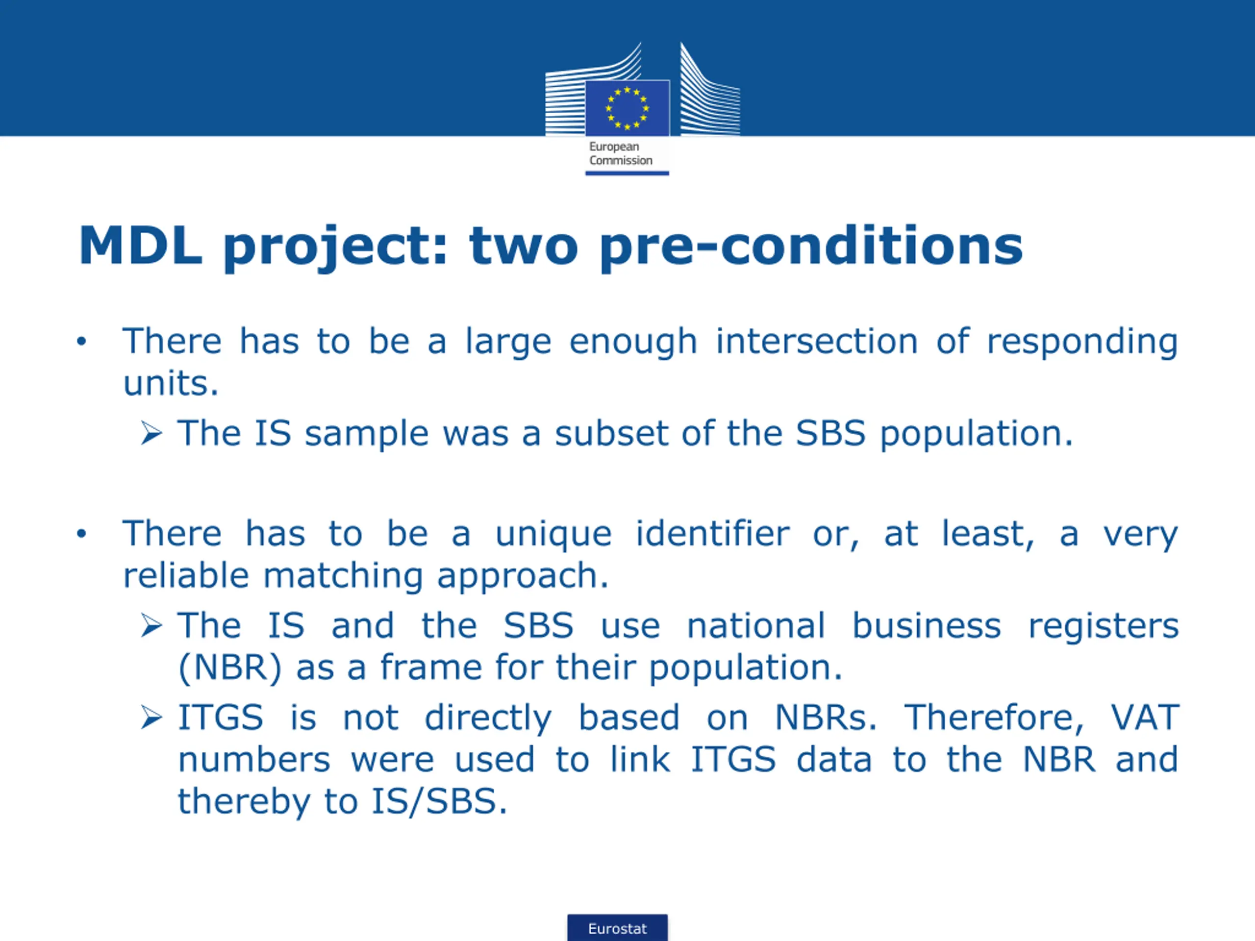 MDL project: two pre-conditions There has to be a large enough intersection of responding units. The IS sample was a subset of the SBS population. There has to be a unique identifier or, at least, a very reliable matching approach. The IS and the SBS use national business registers (NBR) as a frame for their population. ITGS is not directly based on NBRs. Therefore, VAT numbers were used to link ITGS data to the NBR and thereby to IS/SBS. Eurostat
