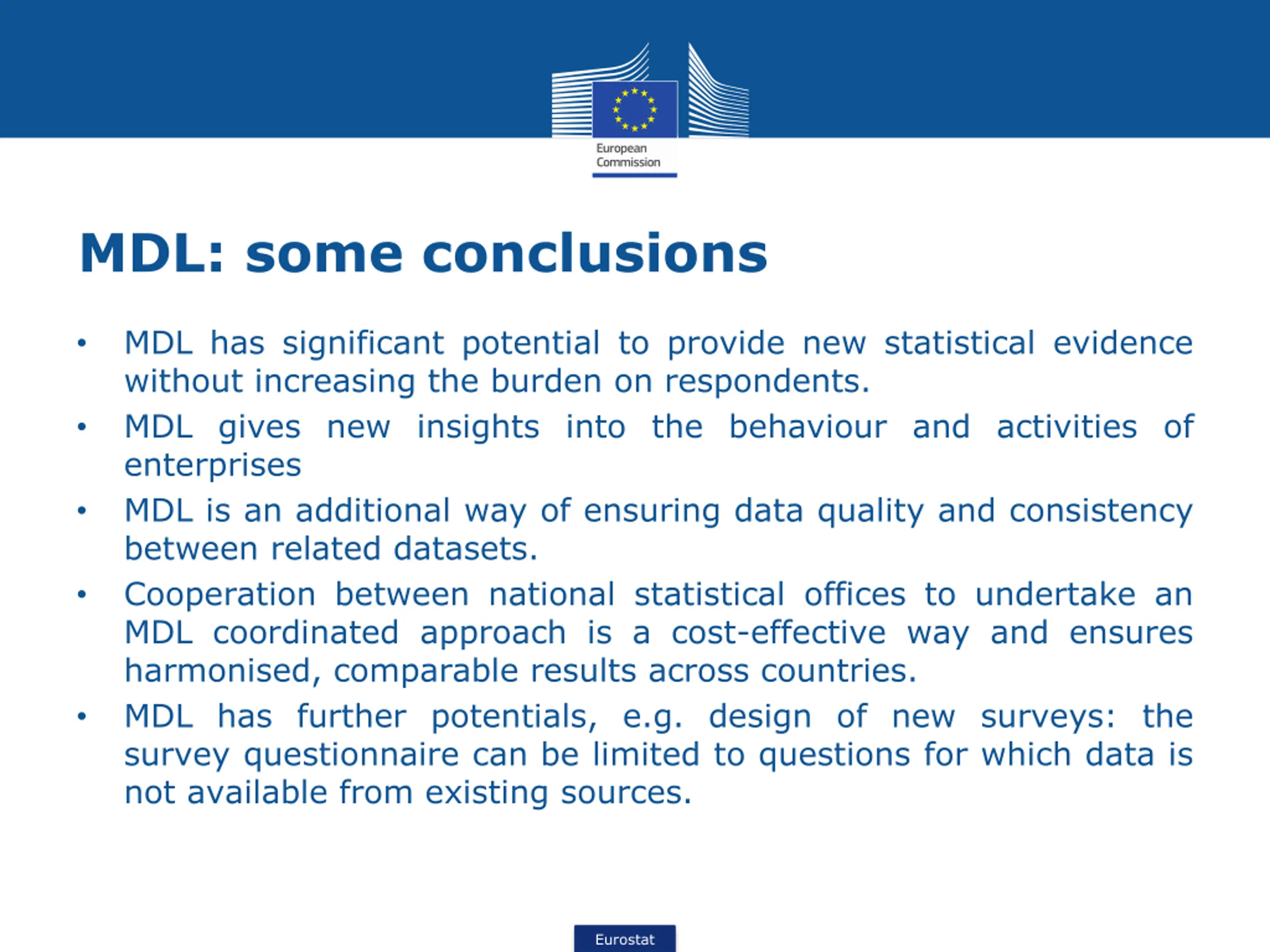 MDL: some conclusions MDL has significant potential to provide new statistical evidence without increasing the burden on respondents. MDL gives new insights into the behaviour and activities of enterprises MDL is an additional way of ensuring data quality and consistency between related datasets. Cooperation between national statistical offices to undertake an MDL coordinated approach is a cost-effective way and ensures harmonised, comparable results across countries. MDL has further potentials, e.g. design of new surveys: the survey questionnaire can be limited to questions for which data is not available from existing sources. Eurostat