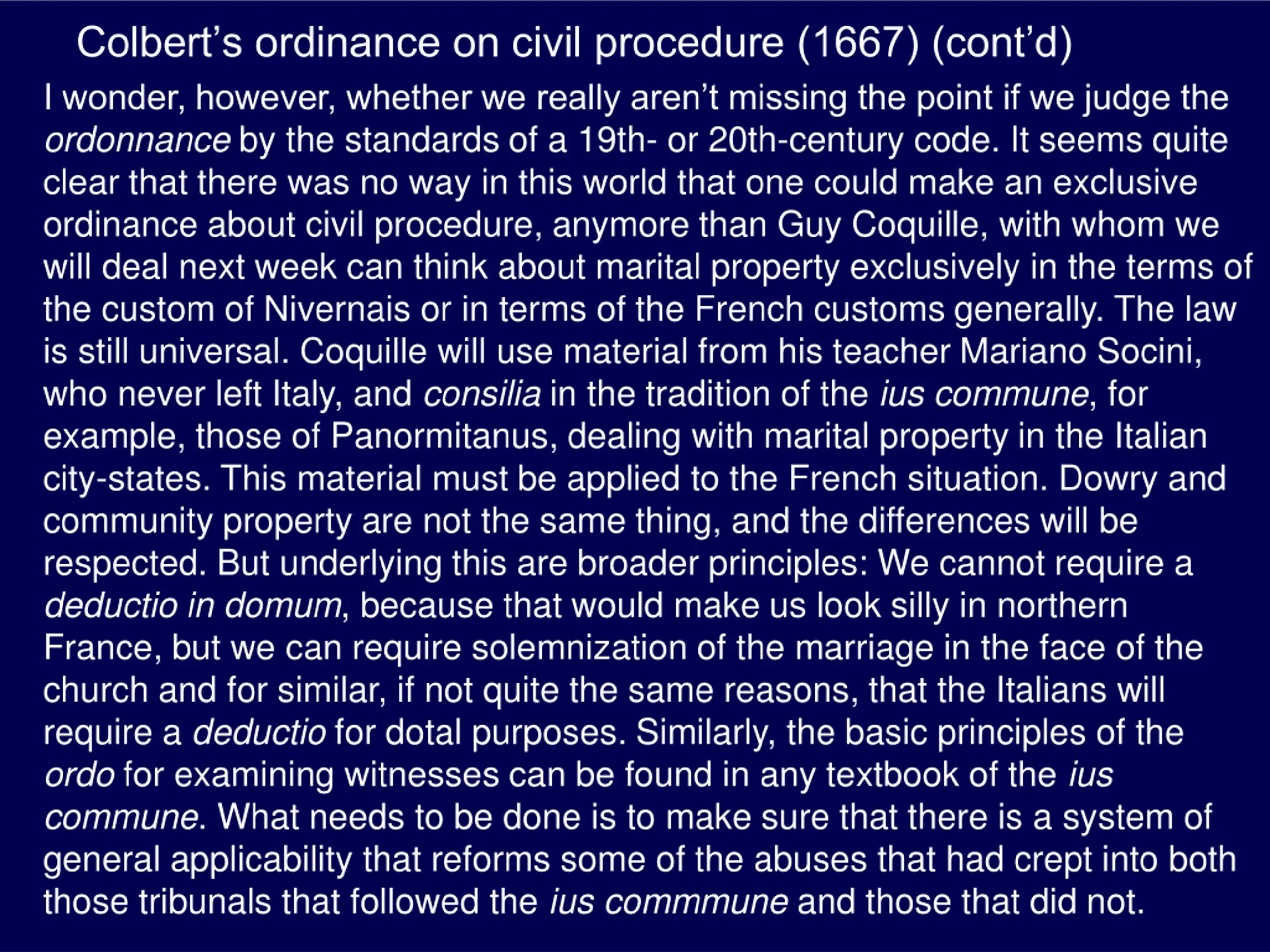 Colberts ordinance on civil procedure (1667) (contd) I wonder, however, whether we really aren t missing the point if we judge the ordonnance by the standards of a 19th- or 20th-century code. It seems quite clear that there was no way in this world that one could make an exclusive ordinance about civil procedure, anymore than Guy Coquille, with whom we will deal next week can think about marital property exclusively in the terms of the custom of Nivernais or in terms of the French customs generally. The law is still universal. Coquille will use material from his teacher Mariano Socini, who never left Italy, and consilia in the tradition of the ius commune, for example, those of Panormitanus, dealing with marital property in the Italian city-states. This material must be applied to the French situation. Dowry and community property are not the same thing, and the differences will be respected. But underlying this are broader principles: We cannot require a deductio in domum, because that would make us look silly in northern France, but we can require solemnization of the marriage in the face of the church and for similar, if not quite the same reasons, that the Italians will require a deductio for dotal purposes. Similarly, the basic principles of the ordo for examining witnesses can be found in any textbook of the ius commune. What needs to be done is to make sure that there is a system of general applicability that reforms some of the abuses that had crept into both those tribunals that followed the ius commmune and those that did not.