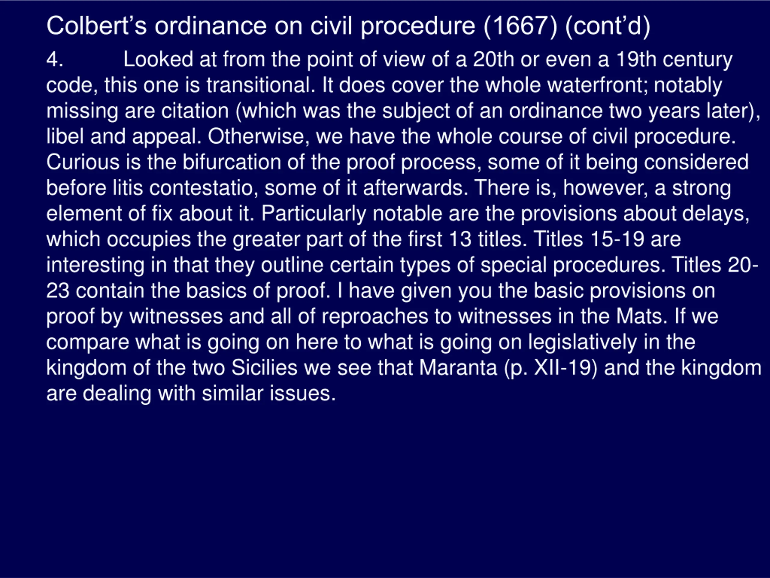 Colberts ordinance on civil procedure (1667) (contd) 4. Looked at from the point of view of a 20th or even a 19th century code, this one is transitional. It does cover the whole waterfront; notably missing are citation (which was the subject of an ordinance two years later), libel and appeal. Otherwise, we have the whole course of civil procedure. Curious is the bifurcation of the proof process, some of it being considered before litis contestatio, some of it afterwards. There is, however, a strong element of fix about it. Particularly notable are the provisions about delays, which occupies the greater part of the first 13 titles. Titles 15-19 are interesting in that they outline certain types of special procedures. Titles 20- 23 contain the basics of proof. I have given you the basic provisions on proof by witnesses and all of reproaches to witnesses in the Mats. If we compare what is going on here to what is going on legislatively in the kingdom of the two Sicilies we see that Maranta (p. XII-19) and the kingdom are dealing with similar issues.