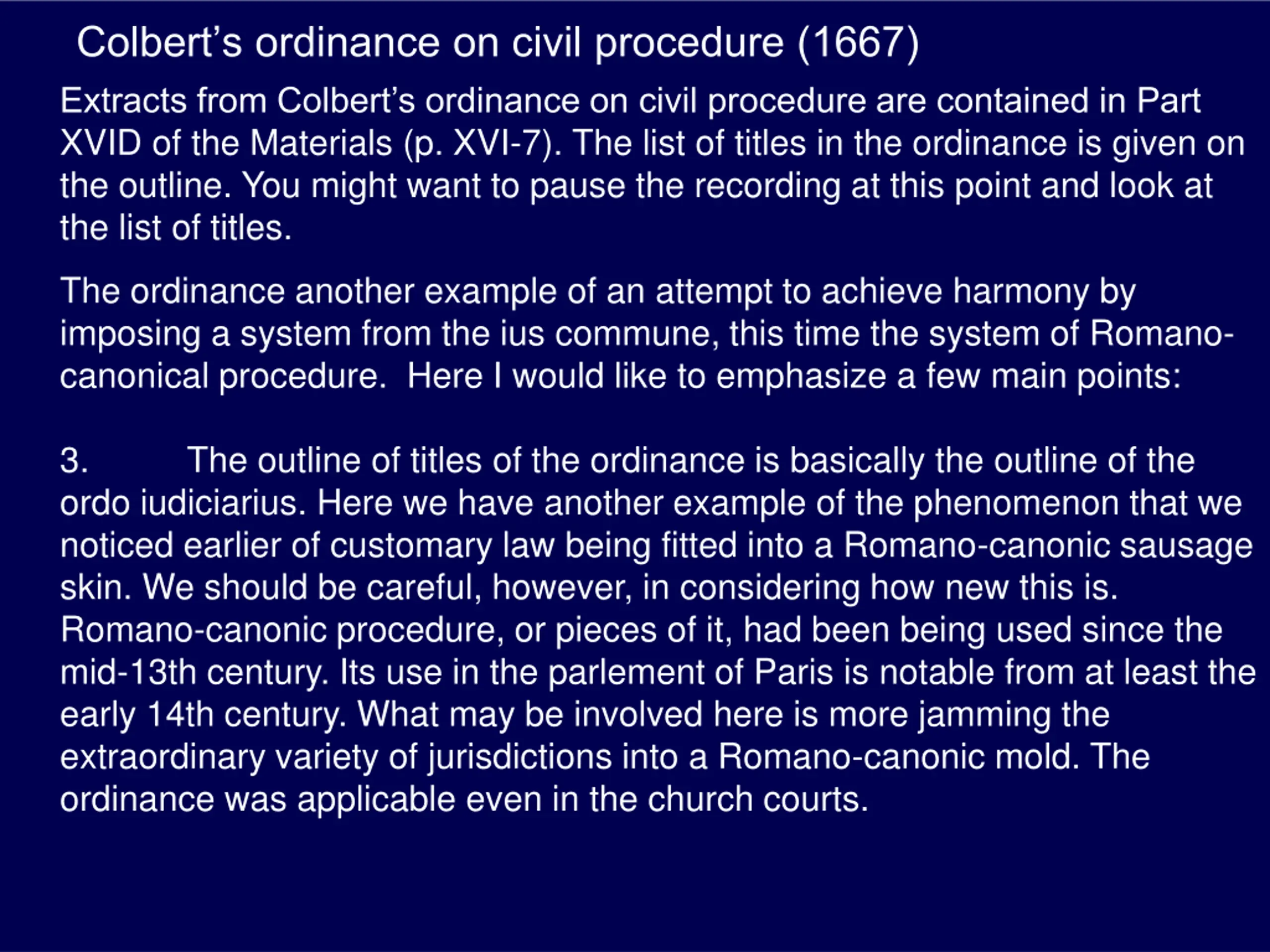 Colberts ordinance on civil procedure (1667) Extracts from Colbert s ordinance on civil procedure are contained in Part XVID of the Materials (p. XVI-7). The list of titles in the ordinance is given on the outline. You might want to pause the recording at this point and look at the list of titles. The ordinance another example of an attempt to achieve harmony by imposing a system from the ius commune, this time the system of Romano- canonical procedure. Here I would like to emphasize a few main points: 3. ordo iudiciarius. Here we have another example of the phenomenon that we noticed earlier of customary law being fitted into a Romano-canonic sausage skin. We should be careful, however, in considering how new this is. Romano-canonic procedure, or pieces of it, had been being used since the mid-13th century. Its use in the parlement of Paris is notable from at least the early 14th century. What may be involved here is more jamming the extraordinary variety of jurisdictions into a Romano-canonic mold. The ordinance was applicable even in the church courts. The outline of titles of the ordinance is basically the outline of the