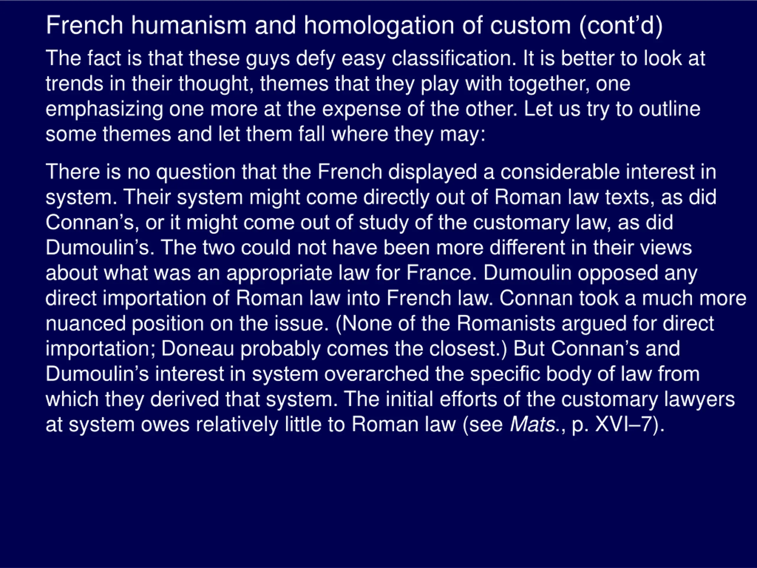 French humanism and homologation of custom (contd) The fact is that these guys defy easy classification. It is better to look at trends in their thought, themes that they play with together, one emphasizing one more at the expense of the other. Let us try to outline some themes and let them fall where they may: There is no question that the French displayed a considerable interest in system. Their system might come directly out of Roman law texts, as did Connan s, or it might come out of study of the customary law, as did Dumoulin s. The two could not have been more different in their views about what was an appropriate law for France. Dumoulin opposed any direct importation of Roman law into French law. Connan took a much more nuanced position on the issue. (None of the Romanists argued for direct importation; Doneau probably comes the closest.) But Connan s and Dumoulin s interest in system overarched the specific body of law from which they derived that system. The initial efforts of the customary lawyers at system owes relatively little to Roman law (see Mats., p. XVI 7).