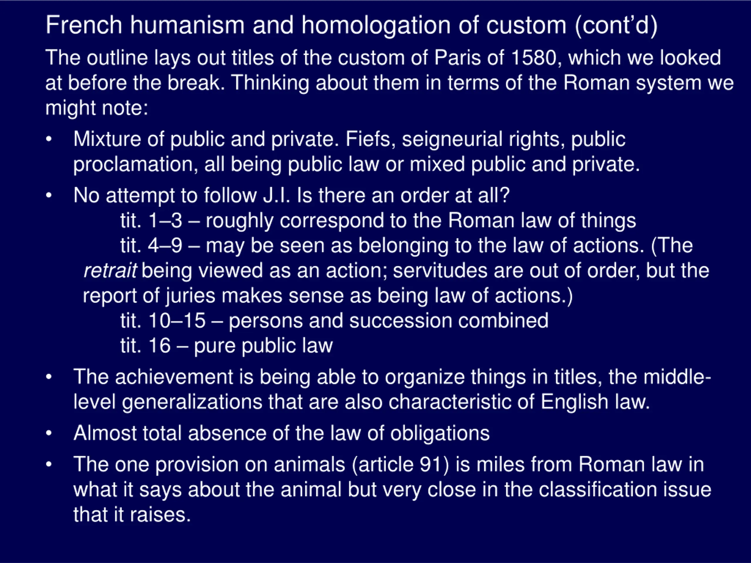 French humanism and homologation of custom (contd) The outline lays out titles of the custom of Paris of 1580, which we looked at before the break. Thinking about them in terms of the Roman system we might note: Mixture of public and private. Fiefs, seigneurial rights, public proclamation, all being public law or mixed public and private. No attempt to follow J.I. Is there an order at all? tit. 1 3 roughly correspond to the Roman law of things tit. 4 9 may be seen as belonging to the law of actions. (The retrait being viewed as an action; servitudes are out of order, but the report of juries makes sense as being law of actions.) tit. 10 15 persons and succession combined tit. 16 pure public law The achievement is being able to organize things in titles, the middle- level generalizations that are also characteristic of English law. Almost total absence of the law of obligations The one provision on animals (article 91) is miles from Roman law in what it says about the animal but very close in the classification issue that it raises.