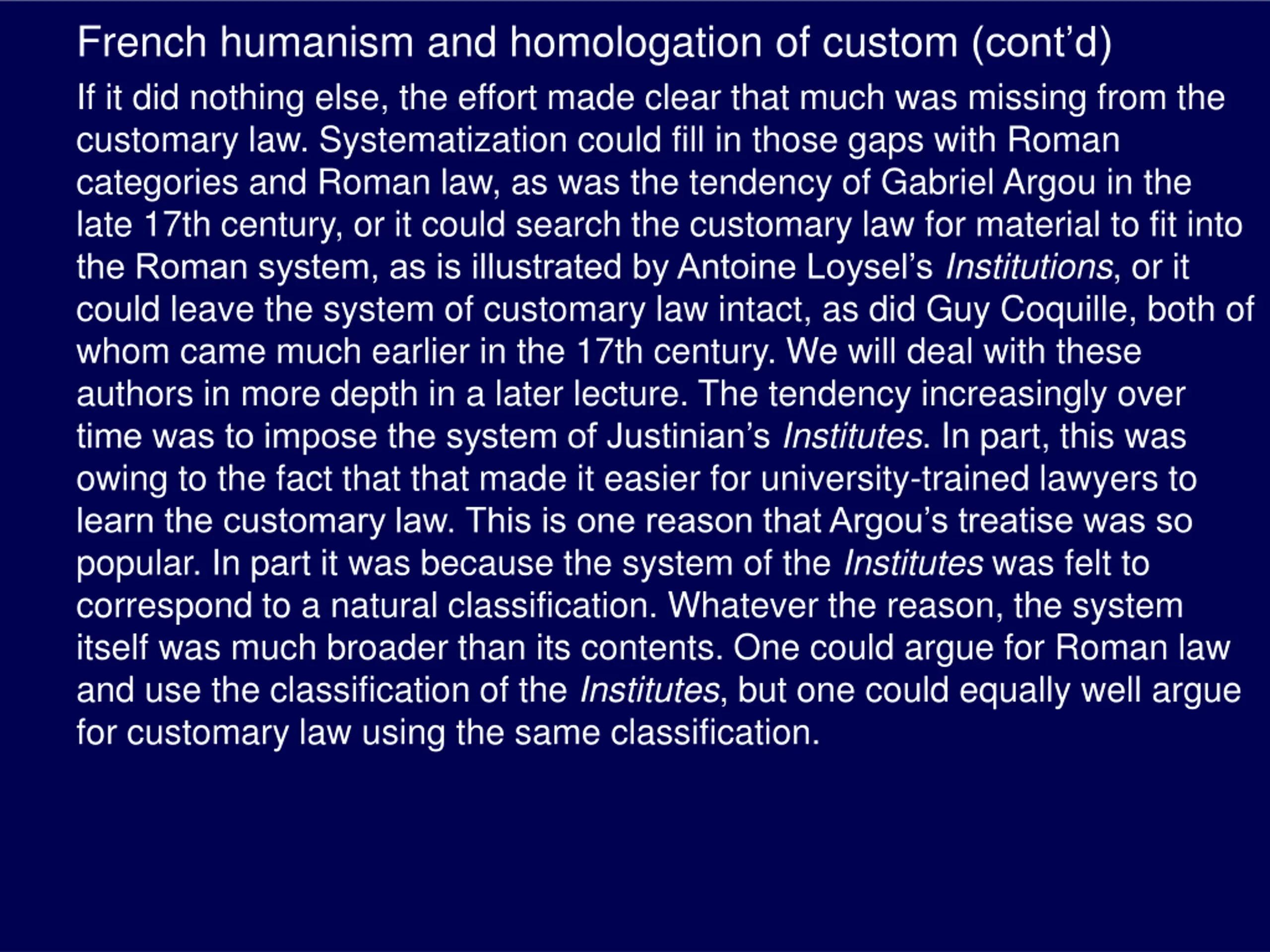 French humanism and homologation of custom (contd) If it did nothing else, the effort made clear that much was missing from the customary law. Systematization could fill in those gaps with Roman categories and Roman law, as was the tendency of Gabriel Argou in the late 17th century, or it could search the customary law for material to fit into the Roman system, as is illustrated by Antoine Loysel s Institutions, or it could leave the system of customary law intact, as did Guy Coquille, both of whom came much earlier in the 17th century. We will deal with these authors in more depth in a later lecture. The tendency increasingly over time was to impose the system of Justinian s Institutes. In part, this was owing to the fact that that made it easier for university-trained lawyers to learn the customary law. This is one reason that Argou s treatise was so popular. In part it was because the system of the Institutes was felt to correspond to a natural classification. Whatever the reason, the system itself was much broader than its contents. One could argue for Roman law and use the classification of the Institutes, but one could equally well argue for customary law using the same classification.