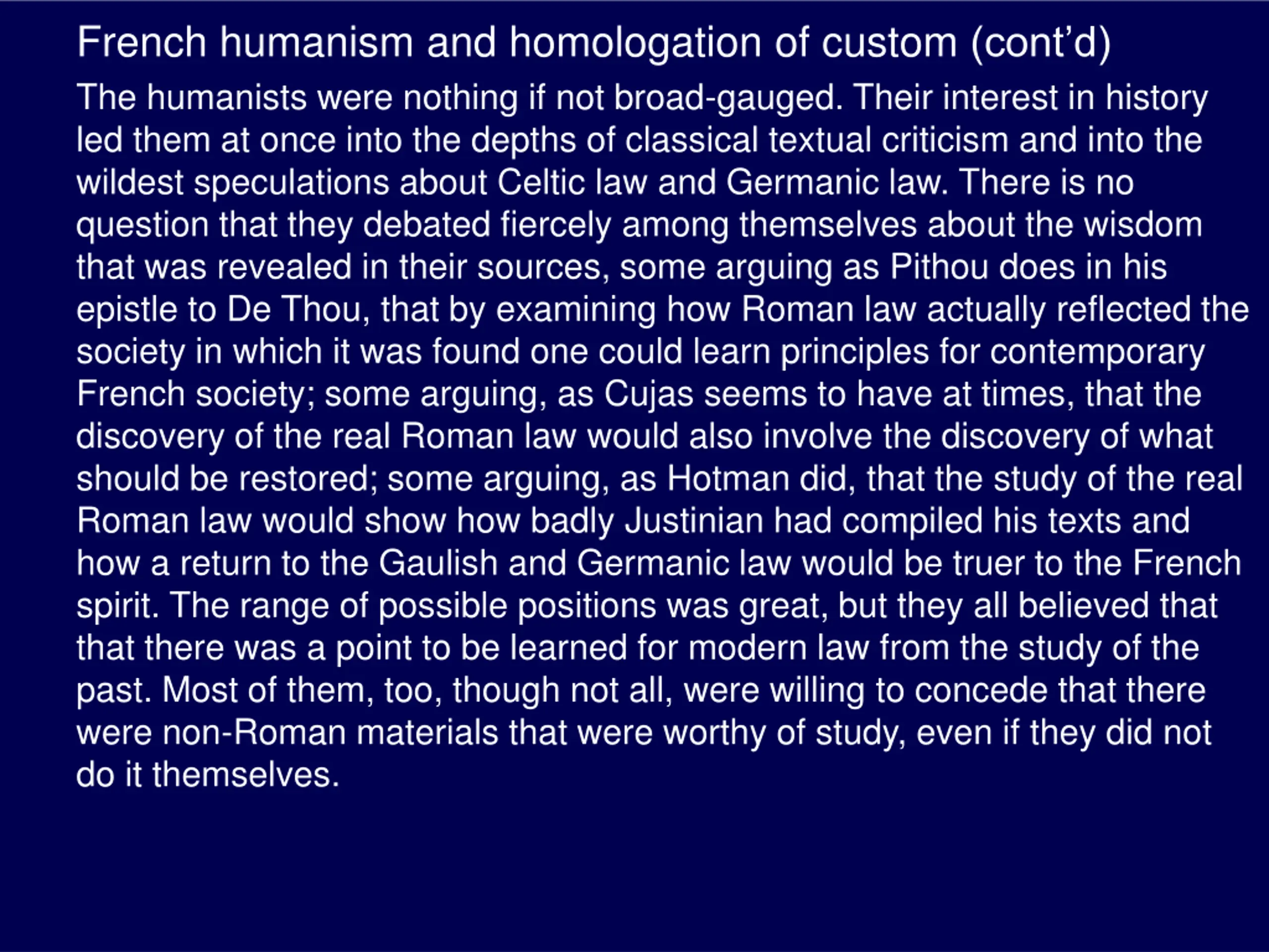 French humanism and homologation of custom (contd) The humanists were nothing if not broad-gauged. Their interest in history led them at once into the depths of classical textual criticism and into the wildest speculations about Celtic law and Germanic law. There is no question that they debated fiercely among themselves about the wisdom that was revealed in their sources, some arguing as Pithou does in his epistle to De Thou, that by examining how Roman law actually reflected the society in which it was found one could learn principles for contemporary French society; some arguing, as Cujas seems to have at times, that the discovery of the real Roman law would also involve the discovery of what should be restored; some arguing, as Hotman did, that the study of the real Roman law would show how badly Justinian had compiled his texts and how a return to the Gaulish and Germanic law would be truer to the French spirit. The range of possible positions was great, but they all believed that that there was a point to be learned for modern law from the study of the past. Most of them, too, though not all, were willing to concede that there were non-Roman materials that were worthy of study, even if they did not do it themselves.