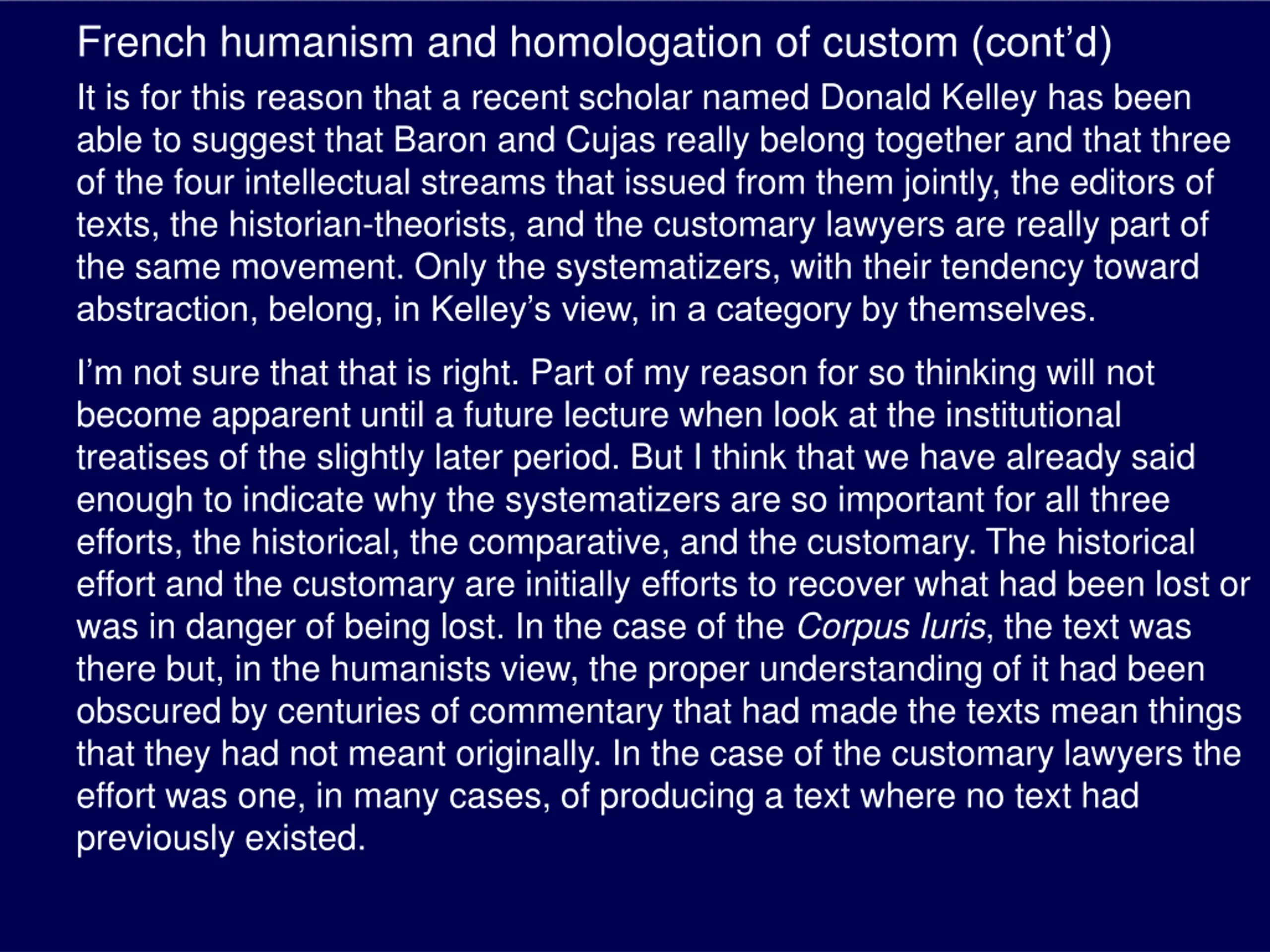 French humanism and homologation of custom (contd) It is for this reason that a recent scholar named Donald Kelley has been able to suggest that Baron and Cujas really belong together and that three of the four intellectual streams that issued from them jointly, the editors of texts, the historian-theorists, and the customary lawyers are really part of the same movement. Only the systematizers, with their tendency toward abstraction, belong, in Kelley s view, in a category by themselves. I m not sure that that is right. Part of my reason for so thinking will not become apparent until a future lecture when look at the institutional treatises of the slightly later period. But I think that we have already said enough to indicate why the systematizers are so important for all three efforts, the historical, the comparative, and the customary. The historical effort and the customary are initially efforts to recover what had been lost or was in danger of being lost. In the case of the Corpus Iuris, the text was there but, in the humanists view, the proper understanding of it had been obscured by centuries of commentary that had made the texts mean things that they had not meant originally. In the case of the customary lawyers the effort was one, in many cases, of producing a text where no text had previously existed.
