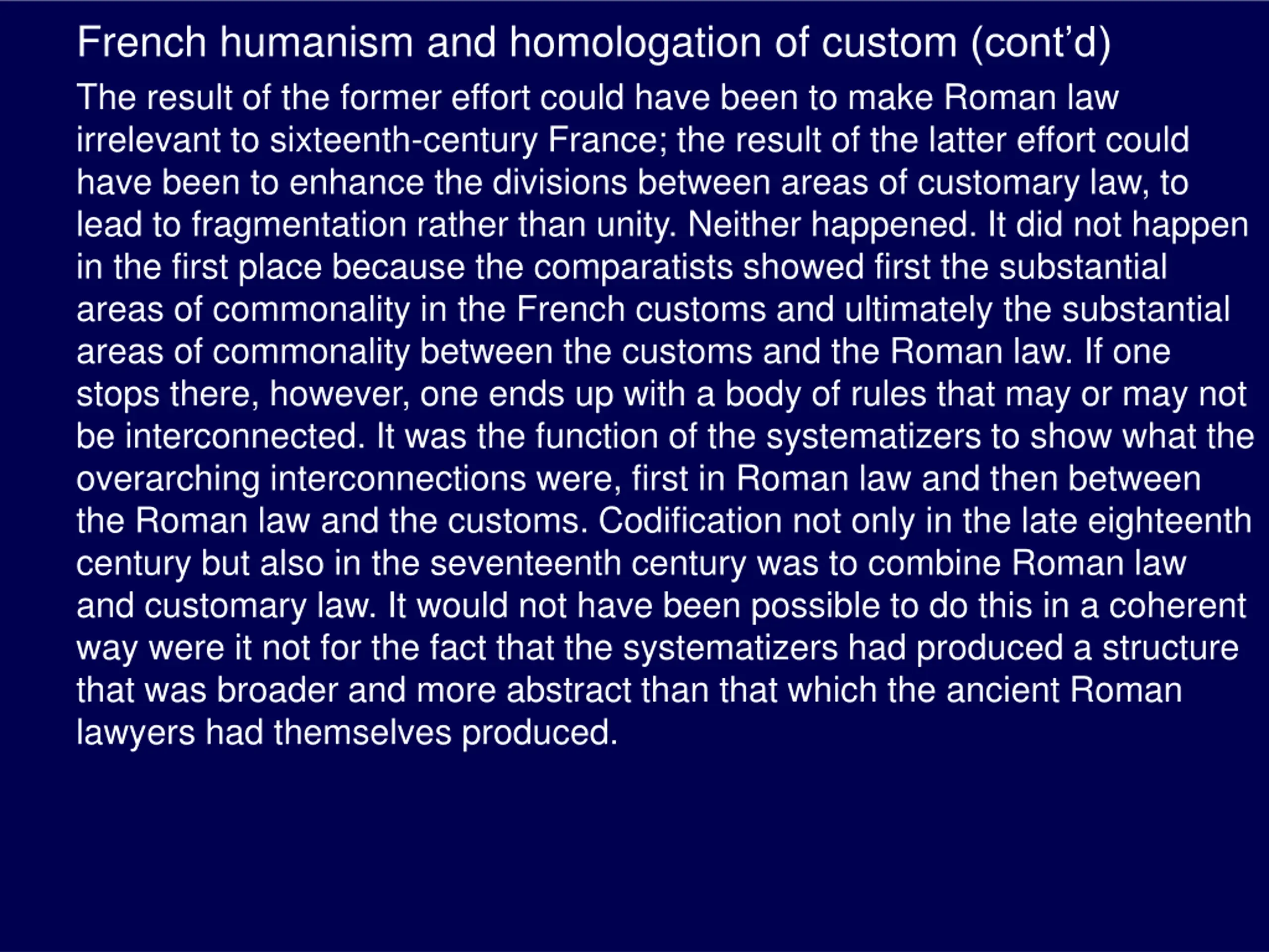 French humanism and homologation of custom (contd) The result of the former effort could have been to make Roman law irrelevant to sixteenth-century France; the result of the latter effort could have been to enhance the divisions between areas of customary law, to lead to fragmentation rather than unity. Neither happened. It did not happen in the first place because the comparatists showed first the substantial areas of commonality in the French customs and ultimately the substantial areas of commonality between the customs and the Roman law. If one stops there, however, one ends up with a body of rules that may or may not be interconnected. It was the function of the systematizers to show what the overarching interconnections were, first in Roman law and then between the Roman law and the customs. Codification not only in the late eighteenth century but also in the seventeenth century was to combine Roman law and customary law. It would not have been possible to do this in a coherent way were it not for the fact that the systematizers had produced a structure that was broader and more abstract than that which the ancient Roman lawyers had themselves produced.