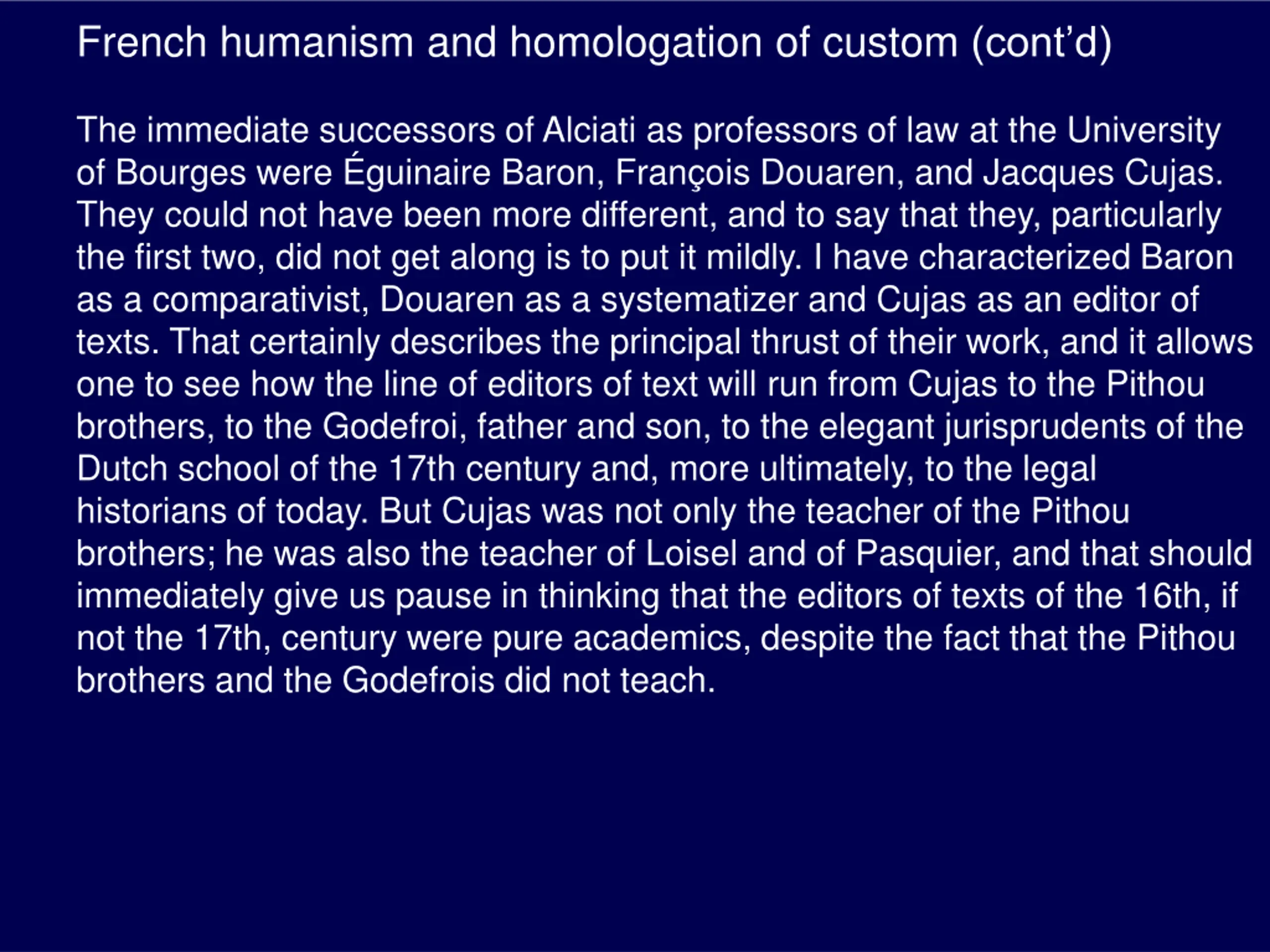 French humanism and homologation of custom (contd) The immediate successors of Alciati as professors of law at the University of Bourges were guinaire Baron, Fran ois Douaren, and Jacques Cujas. They could not have been more different, and to say that they, particularly the first two, did not get along is to put it mildly. I have characterized Baron as a comparativist, Douaren as a systematizer and Cujas as an editor of texts. That certainly describes the principal thrust of their work, and it allows one to see how the line of editors of text will run from Cujas to the Pithou brothers, to the Godefroi, father and son, to the elegant jurisprudents of the Dutch school of the 17th century and, more ultimately, to the legal historians of today. But Cujas was not only the teacher of the Pithou brothers; he was also the teacher of Loisel and of Pasquier, and that should immediately give us pause in thinking that the editors of texts of the 16th, if not the 17th, century were pure academics, despite the fact that the Pithou brothers and the Godefrois did not teach.