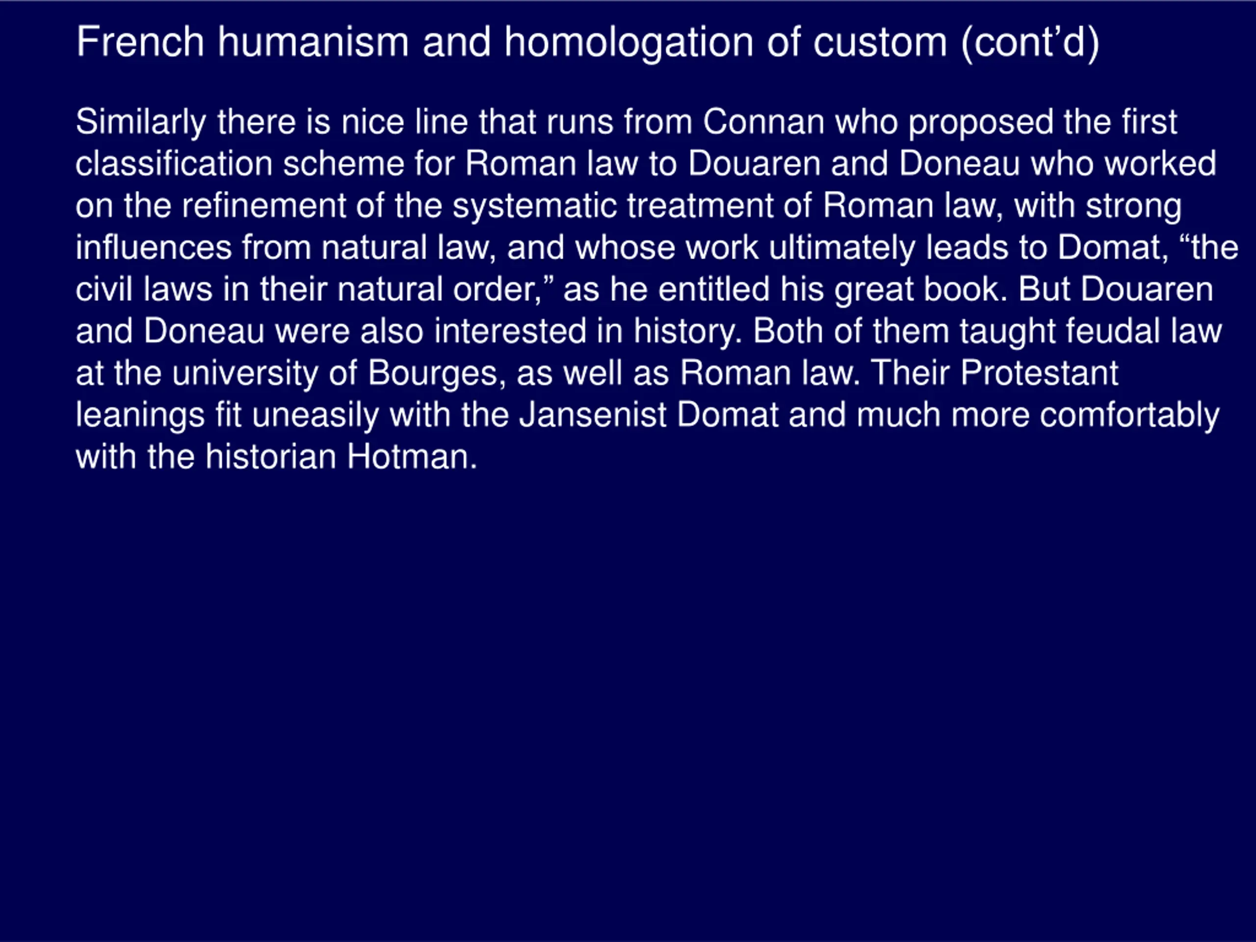 French humanism and homologation of custom (contd) Similarly there is nice line that runs from Connan who proposed the first classification scheme for Roman law to Douaren and Doneau who worked on the refinement of the systematic treatment of Roman law, with strong influences from natural law, and whose work ultimately leads to Domat, the civil laws in their natural order, as he entitled his great book. But Douaren and Doneau were also interested in history. Both of them taught feudal law at the university of Bourges, as well as Roman law. Their Protestant leanings fit uneasily with the Jansenist Domat and much more comfortably with the historian Hotman.