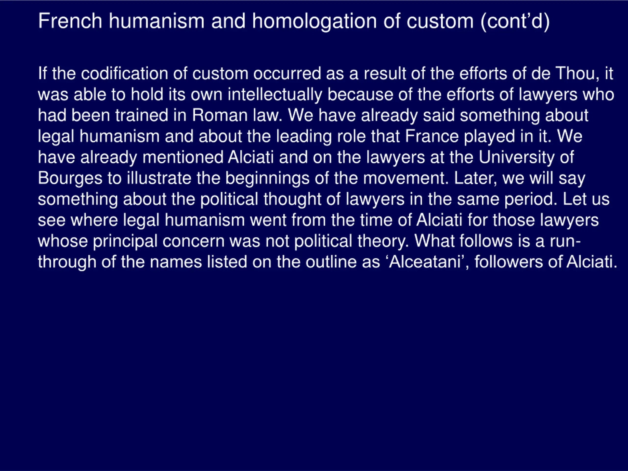 French humanism and homologation of custom (contd) If the codification of custom occurred as a result of the efforts of de Thou, it was able to hold its own intellectually because of the efforts of lawyers who had been trained in Roman law. We have already said something about legal humanism and about the leading role that France played in it. We have already mentioned Alciati and on the lawyers at the University of Bourges to illustrate the beginnings of the movement. Later, we will say something about the political thought of lawyers in the same period. Let us see where legal humanism went from the time of Alciati for those lawyers whose principal concern was not political theory. What follows is a run- through of the names listed on the outline as Alceatani , followers of Alciati.