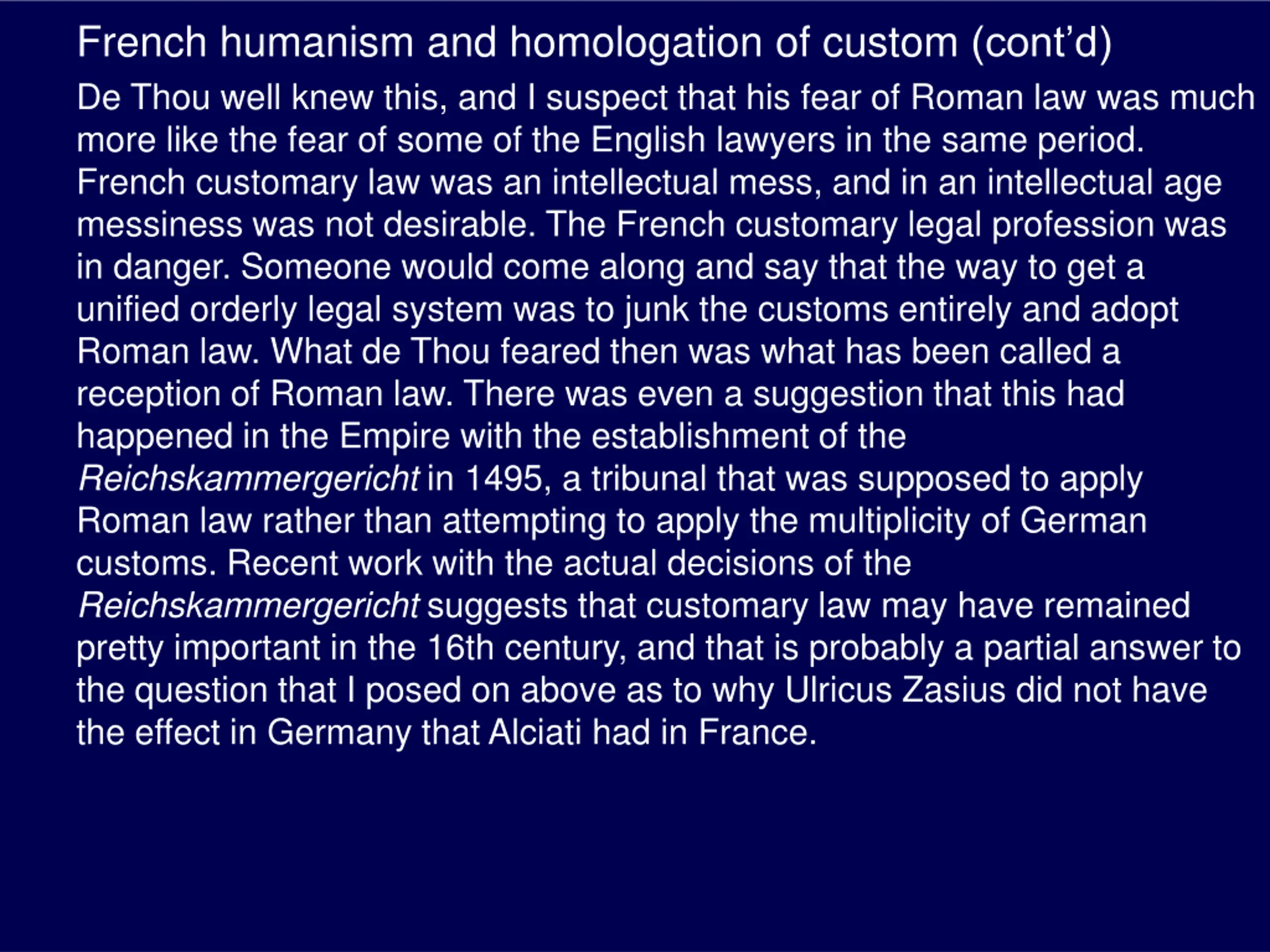French humanism and homologation of custom (contd) De Thou well knew this, and I suspect that his fear of Roman law was much more like the fear of some of the English lawyers in the same period. French customary law was an intellectual mess, and in an intellectual age messiness was not desirable. The French customary legal profession was in danger. Someone would come along and say that the way to get a unified orderly legal system was to junk the customs entirely and adopt Roman law. What de Thou feared then was what has been called a reception of Roman law. There was even a suggestion that this had happened in the Empire with the establishment of the Reichskammergericht in 1495, a tribunal that was supposed to apply Roman law rather than attempting to apply the multiplicity of German customs. Recent work with the actual decisions of the Reichskammergericht suggests that customary law may have remained pretty important in the 16th century, and that is probably a partial answer to the question that I posed on above as to why Ulricus Zasius did not have the effect in Germany that Alciati had in France.