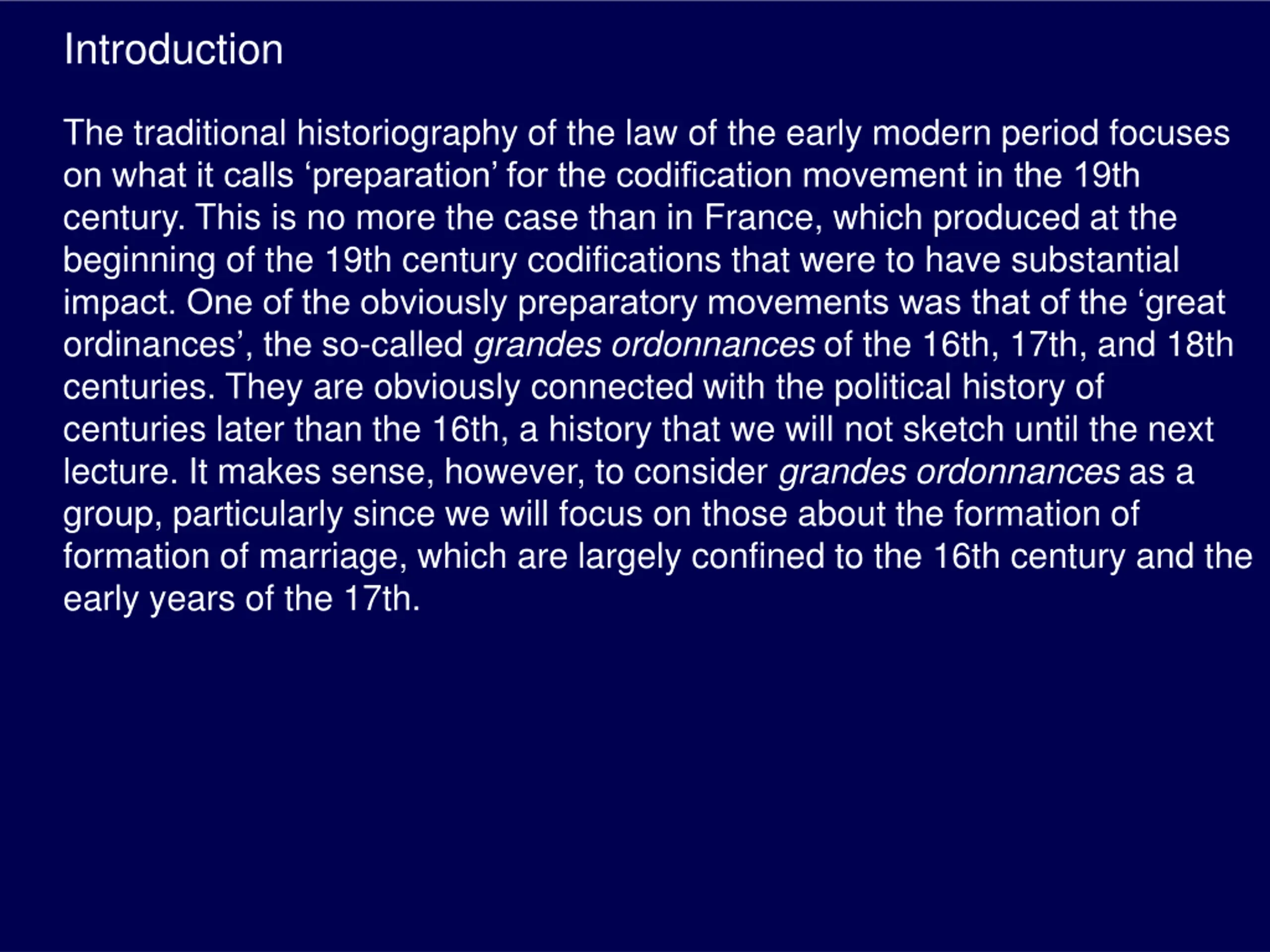 Introduction The traditional historiography of the law of the early modern period focuses on what it calls preparation for the codification movement in the 19th century. This is no more the case than in France, which produced at the beginning of the 19th century codifications that were to have substantial impact. One of the obviously preparatory movements was that of the great ordinances , the so-called grandes ordonnances of the 16th, 17th, and 18th centuries. They are obviously connected with the political history of centuries later than the 16th, a history that we will not sketch until the next lecture. It makes sense, however, to consider grandes ordonnances as a group, particularly since we will focus on those about the formation of formation of marriage, which are largely confined to the 16th century and the early years of the 17th.