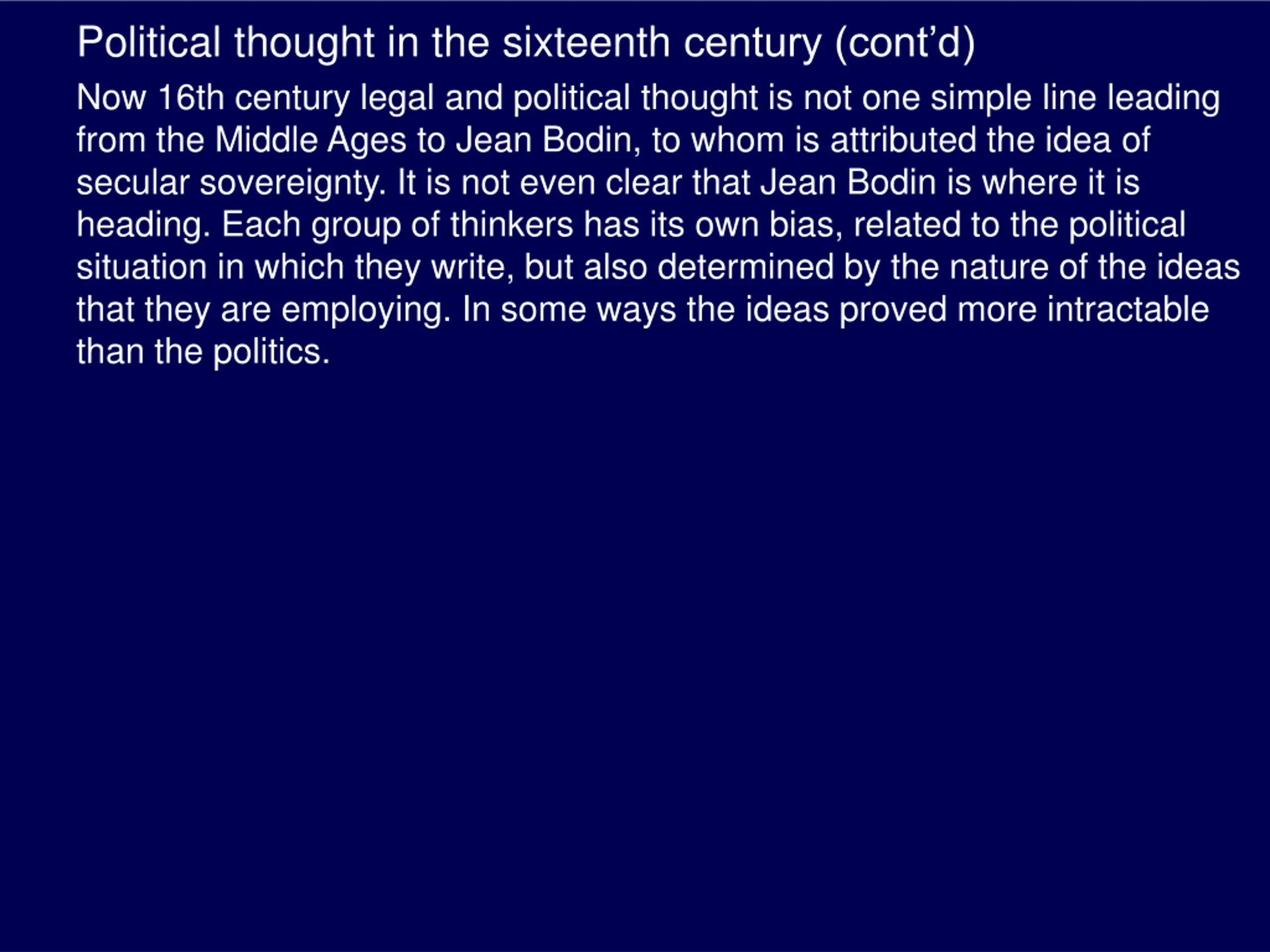Political thought in the sixteenth century (contd) Now 16th century legal and political thought is not one simple line leading from the Middle Ages to Jean Bodin, to whom is attributed the idea of secular sovereignty. It is not even clear that Jean Bodin is where it is heading. Each group of thinkers has its own bias, related to the political situation in which they write, but also determined by the nature of the ideas that they are employing. In some ways the ideas proved more intractable than the politics.