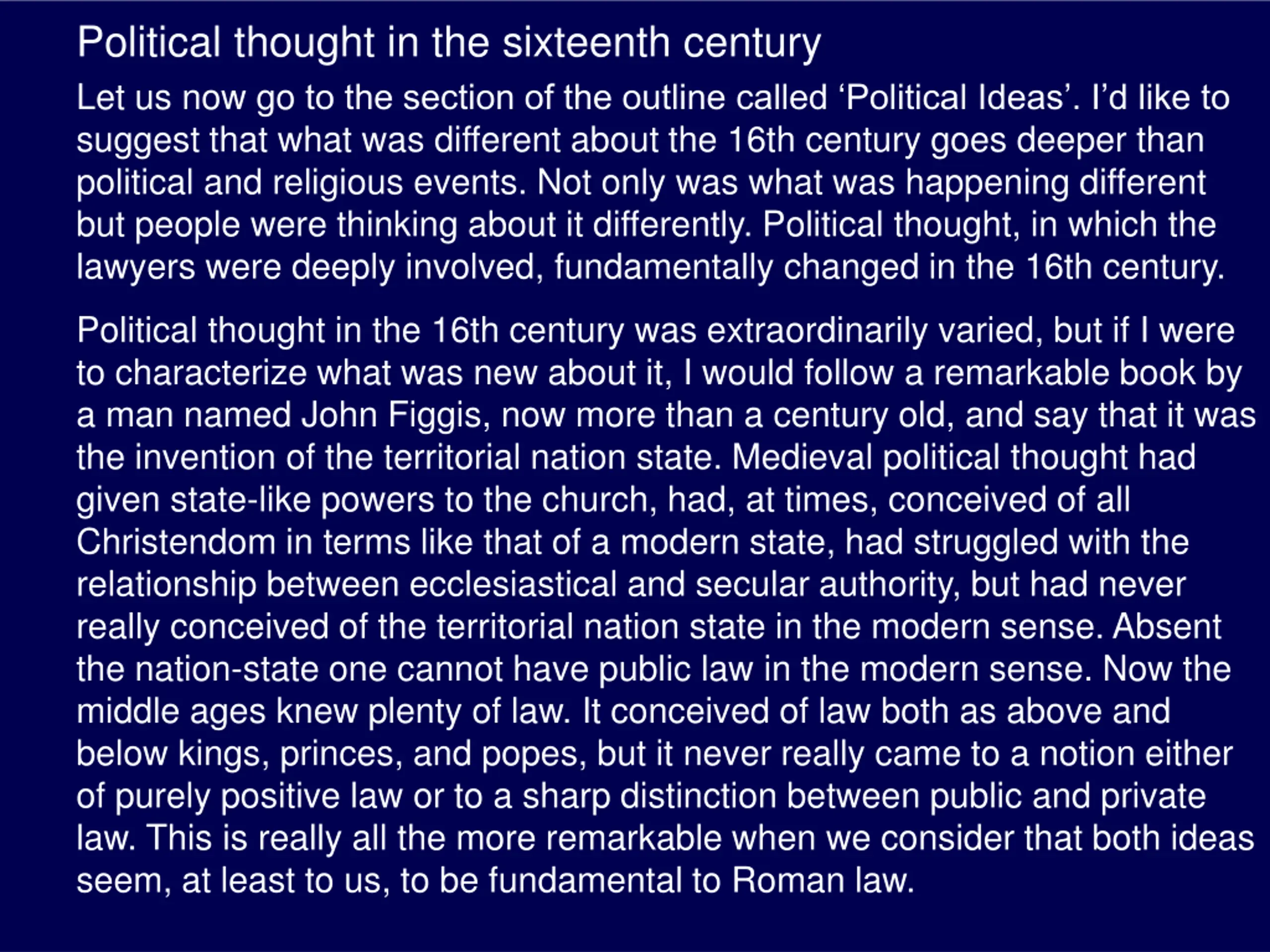 Political thought in the sixteenth century Let us now go to the section of the outline called Political Ideas . I d like to suggest that what was different about the 16th century goes deeper than political and religious events. Not only was what was happening different but people were thinking about it differently. Political thought, in which the lawyers were deeply involved, fundamentally changed in the 16th century. Political thought in the 16th century was extraordinarily varied, but if I were to characterize what was new about it, I would follow a remarkable book by a man named John Figgis, now more than a century old, and say that it was the invention of the territorial nation state. Medieval political thought had given state-like powers to the church, had, at times, conceived of all Christendom in terms like that of a modern state, had struggled with the relationship between ecclesiastical and secular authority, but had never really conceived of the territorial nation state in the modern sense. Absent the nation-state one cannot have public law in the modern sense. Now the middle ages knew plenty of law. It conceived of law both as above and below kings, princes, and popes, but it never really came to a notion either of purely positive law or to a sharp distinction between public and private law. This is really all the more remarkable when we consider that both ideas seem, at least to us, to be fundamental to Roman law.