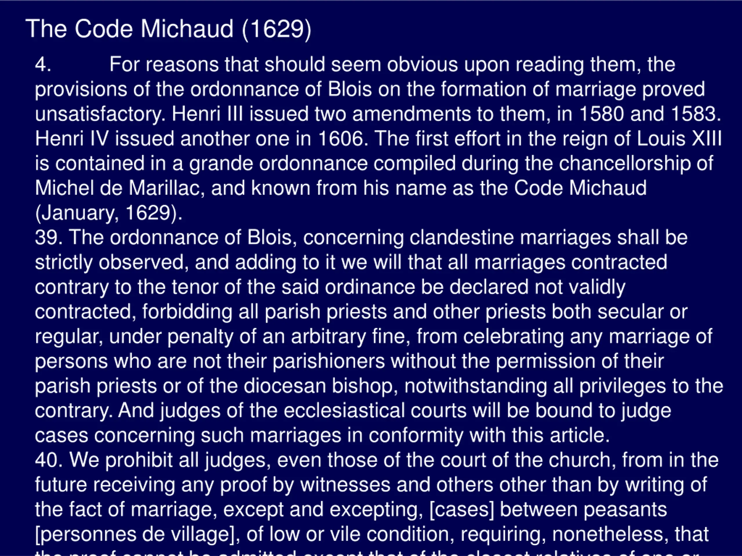 The Code Michaud (1629) 4. For reasons that should seem obvious upon reading them, the provisions of the ordonnance of Blois on the formation of marriage proved unsatisfactory. Henri III issued two amendments to them, in 1580 and 1583. Henri IV issued another one in 1606. The first effort in the reign of Louis XIII is contained in a grande ordonnance compiled during the chancellorship of Michel de Marillac, and known from his name as the Code Michaud (January, 1629). 39. The ordonnance of Blois, concerning clandestine marriages shall be strictly observed, and adding to it we will that all marriages contracted contrary to the tenor of the said ordinance be declared not validly contracted, forbidding all parish priests and other priests both secular or regular, under penalty of an arbitrary fine, from celebrating any marriage of persons who are not their parishioners without the permission of their parish priests or of the diocesan bishop, notwithstanding all privileges to the contrary. And judges of the ecclesiastical courts will be bound to judge cases concerning such marriages in conformity with this article. 40. We prohibit all judges, even those of the court of the church, from in the future receiving any proof by witnesses and others other than by writing of the fact of marriage, except and excepting, [cases] between peasants [personnes de village], of low or vile condition, requiring, nonetheless, that the proof cannot be admitted except that of the closest relatives of one or