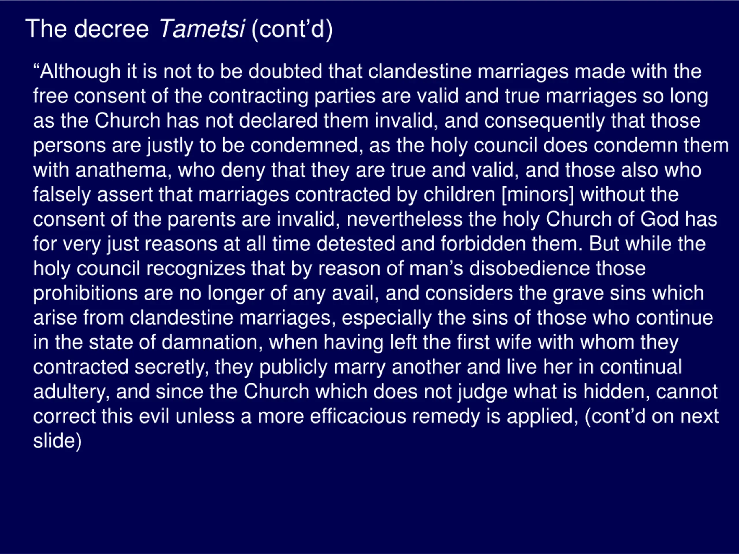 The decree Tametsi (contd) Although it is not to be doubted that clandestine marriages made with the free consent of the contracting parties are valid and true marriages so long as the Church has not declared them invalid, and consequently that those persons are justly to be condemned, as the holy council does condemn them with anathema, who deny that they are true and valid, and those also who falsely assert that marriages contracted by children [minors] without the consent of the parents are invalid, nevertheless the holy Church of God has for very just reasons at all time detested and forbidden them. But while the holy council recognizes that by reason of man s disobedience those prohibitions are no longer of any avail, and considers the grave sins which arise from clandestine marriages, especially the sins of those who continue in the state of damnation, when having left the first wife with whom they contracted secretly, they publicly marry another and live her in continual adultery, and since the Church which does not judge what is hidden, cannot correct this evil unless a more efficacious remedy is applied, (cont d on next slide)