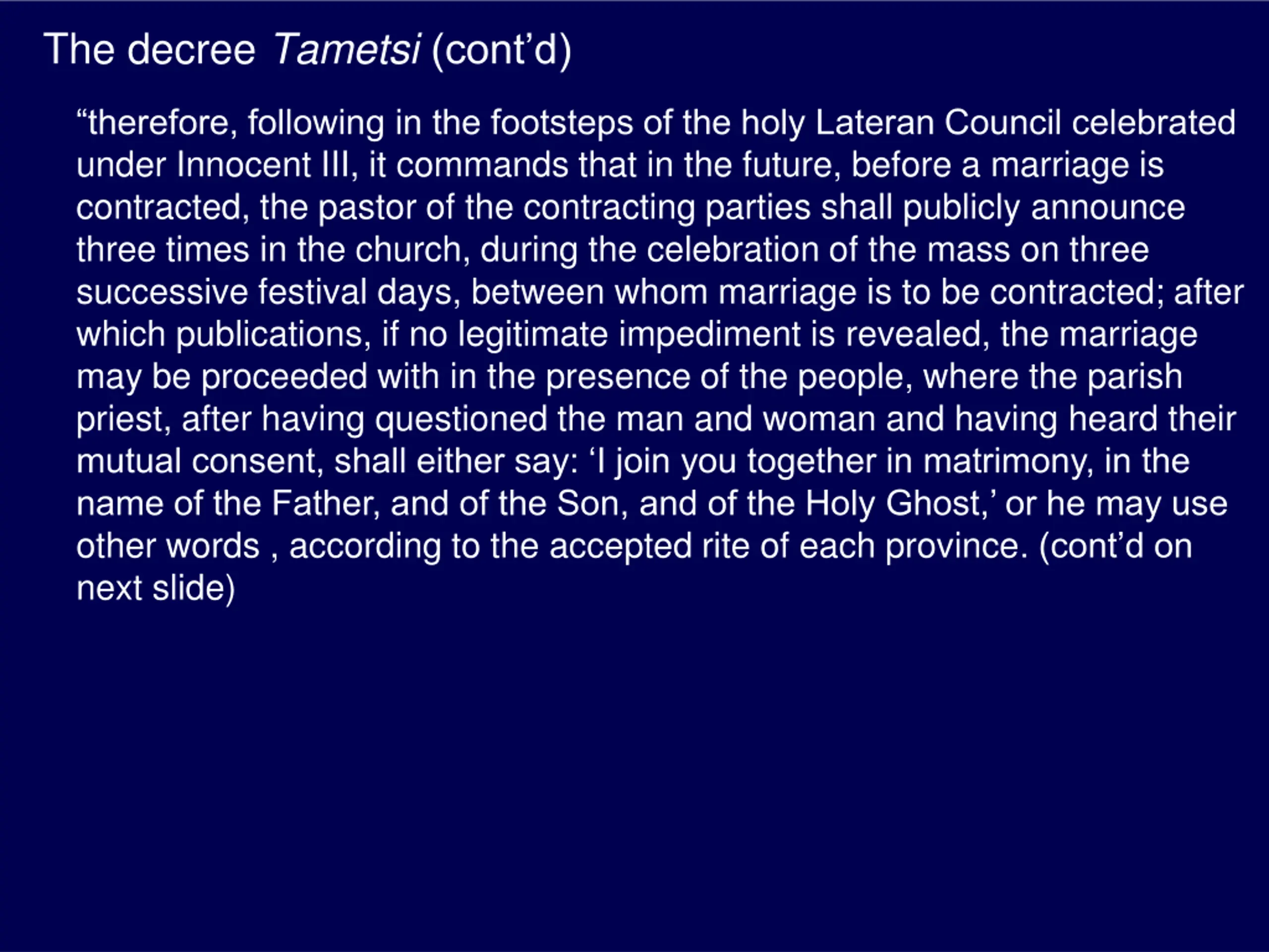 The decree Tametsi (contd) therefore, following in the footsteps of the holy Lateran Council celebrated under Innocent III, it commands that in the future, before a marriage is contracted, the pastor of the contracting parties shall publicly announce three times in the church, during the celebration of the mass on three successive festival days, between whom marriage is to be contracted; after which publications, if no legitimate impediment is revealed, the marriage may be proceeded with in the presence of the people, where the parish priest, after having questioned the man and woman and having heard their mutual consent, shall either say: I join you together in matrimony, in the name of the Father, and of the Son, and of the Holy Ghost, or he may use other words , according to the accepted rite of each province. (cont d on next slide)