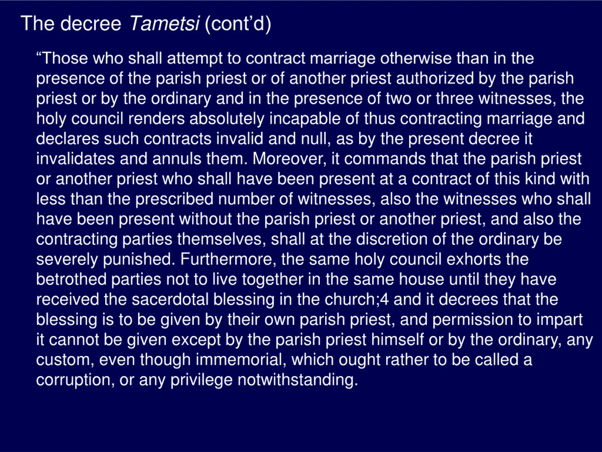 The decree Tametsi (contd) Those who shall attempt to contract marriage otherwise than in the presence of the parish priest or of another priest authorized by the parish priest or by the ordinary and in the presence of two or three witnesses, the holy council renders absolutely incapable of thus contracting marriage and declares such contracts invalid and null, as by the present decree it invalidates and annuls them. Moreover, it commands that the parish priest or another priest who shall have been present at a contract of this kind with less than the prescribed number of witnesses, also the witnesses who shall have been present without the parish priest or another priest, and also the contracting parties themselves, shall at the discretion of the ordinary be severely punished. Furthermore, the same holy council exhorts the betrothed parties not to live together in the same house until they have received the sacerdotal blessing in the church;4 and it decrees that the blessing is to be given by their own parish priest, and permission to impart it cannot be given except by the parish priest himself or by the ordinary, any custom, even though immemorial, which ought rather to be called a corruption, or any privilege notwithstanding.