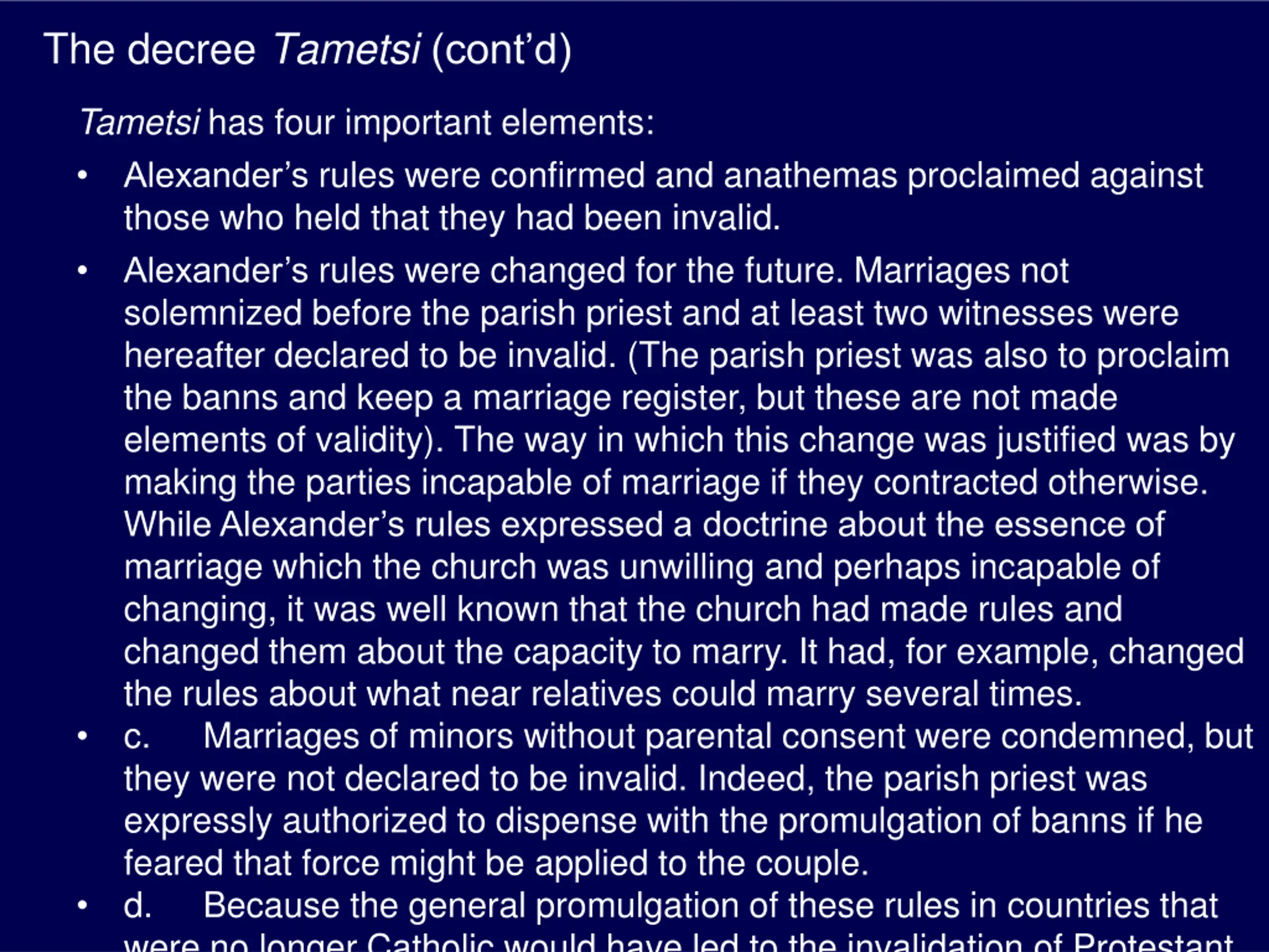 The decree Tametsi (contd) Tametsi has four important elements: Alexander s rules were confirmed and anathemas proclaimed against those who held that they had been invalid. Alexander s rules were changed for the future. Marriages not solemnized before the parish priest and at least two witnesses were hereafter declared to be invalid. (The parish priest was also to proclaim the banns and keep a marriage register, but these are not made elements of validity). The way in which this change was justified was by making the parties incapable of marriage if they contracted otherwise. While Alexander s rules expressed a doctrine about the essence of marriage which the church was unwilling and perhaps incapable of changing, it was well known that the church had made rules and changed them about the capacity to marry. It had, for example, changed the rules about what near relatives could marry several times. c. Marriages of minors without parental consent were condemned, but they were not declared to be invalid. Indeed, the parish priest was expressly authorized to dispense with the promulgation of banns if he feared that force might be applied to the couple. d. Because the general promulgation of these rules in countries that were no longer Catholic would have led to the invalidation of Protestant