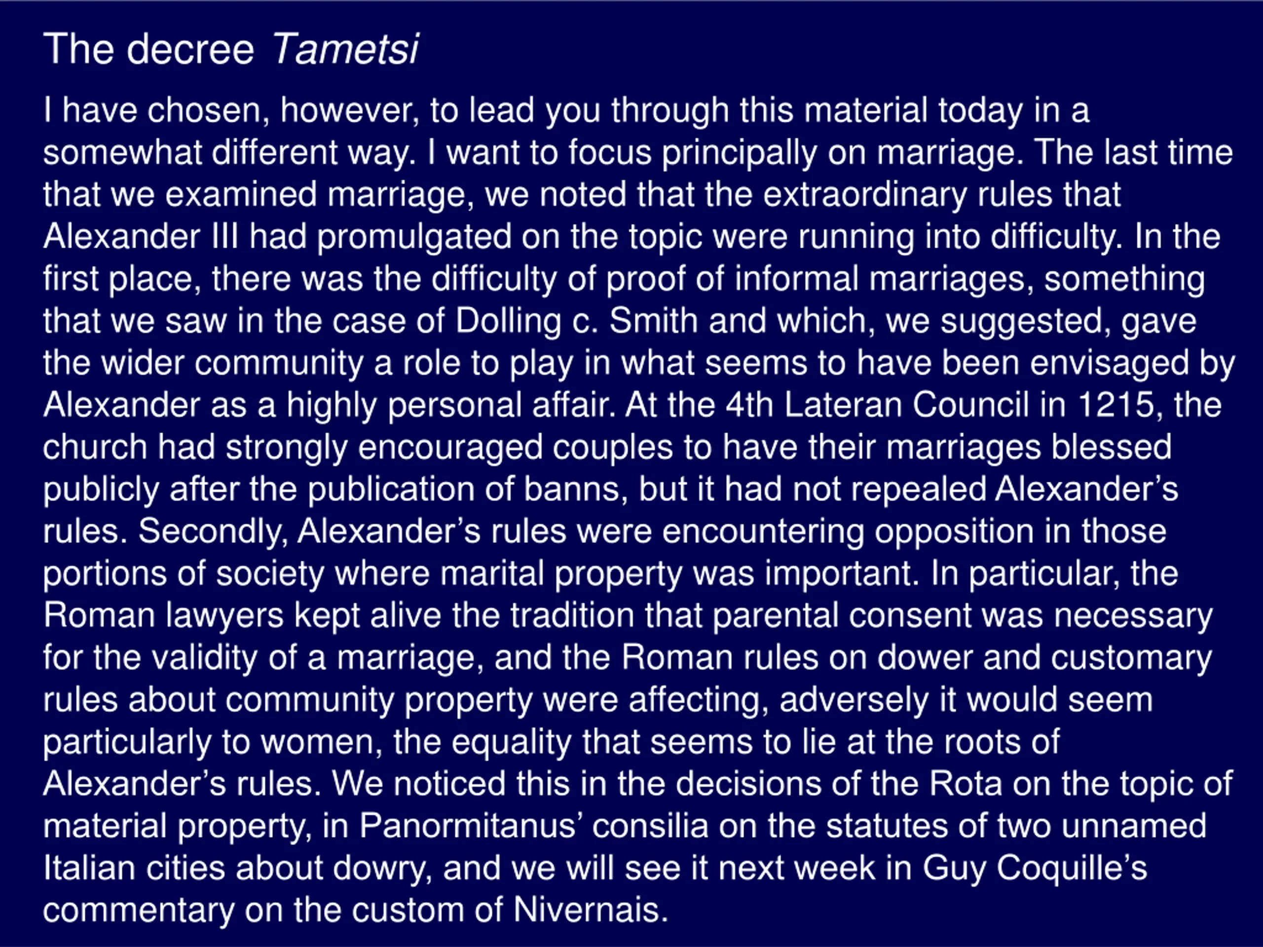 The decree Tametsi I have chosen, however, to lead you through this material today in a somewhat different way. I want to focus principally on marriage. The last time that we examined marriage, we noted that the extraordinary rules that Alexander III had promulgated on the topic were running into difficulty. In the first place, there was the difficulty of proof of informal marriages, something that we saw in the case of Dolling c. Smith and which, we suggested, gave the wider community a role to play in what seems to have been envisaged by Alexander as a highly personal affair. At the 4th Lateran Council in 1215, the church had strongly encouraged couples to have their marriages blessed publicly after the publication of banns, but it had not repealed Alexander s rules. Secondly, Alexander s rules were encountering opposition in those portions of society where marital property was important. In particular, the Roman lawyers kept alive the tradition that parental consent was necessary for the validity of a marriage, and the Roman rules on dower and customary rules about community property were affecting, adversely it would seem particularly to women, the equality that seems to lie at the roots of Alexander s rules. We noticed this in the decisions of the Rota on the topic of material property, in Panormitanus consilia on the statutes of two unnamed Italian cities about dowry, and we will see it next week in Guy Coquille s commentary on the custom of Nivernais.