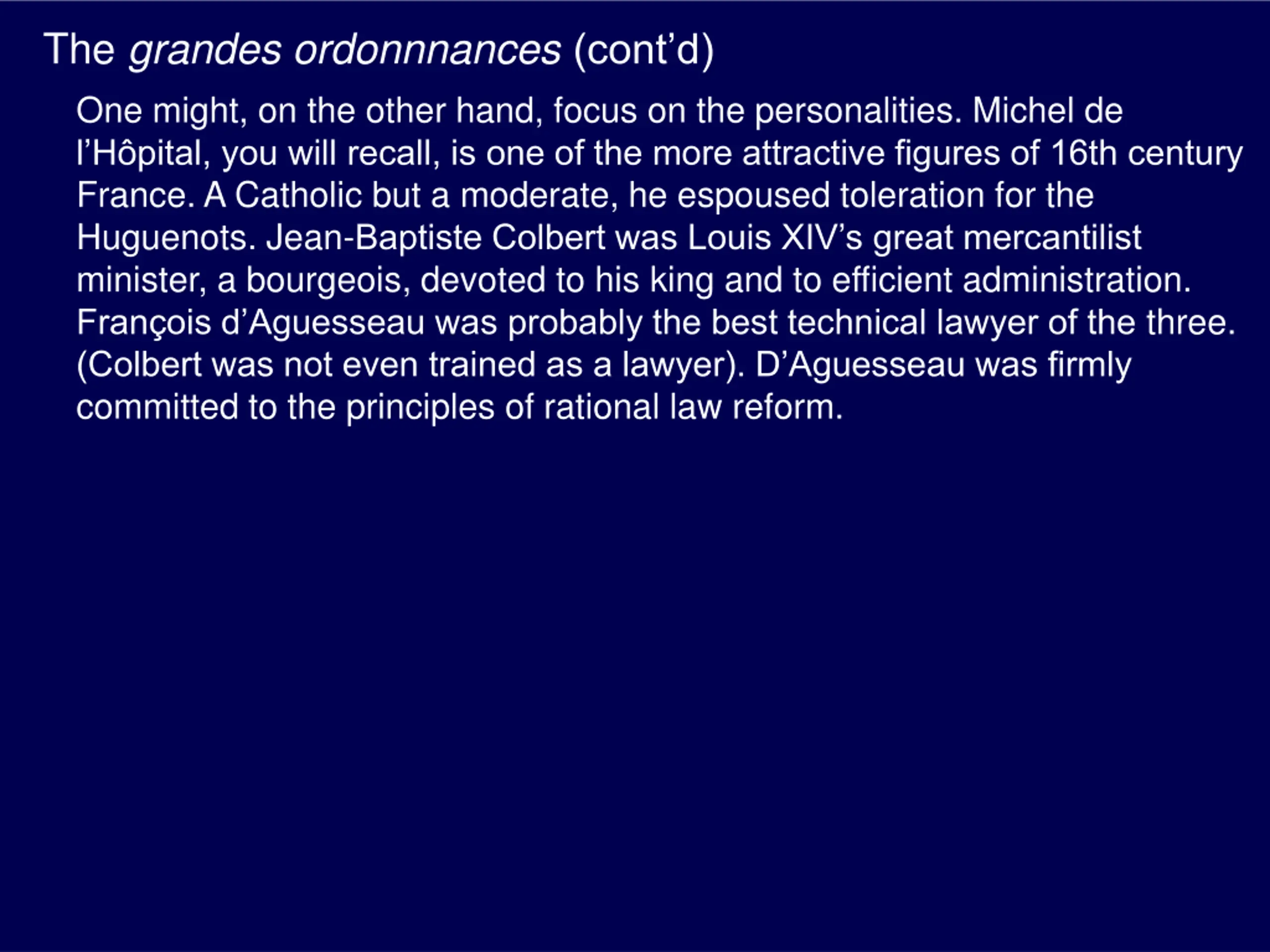 The grandes ordonnnances(contd) One might, on the other hand, focus on the personalities. Michel de l H pital, you will recall, is one of the more attractive figures of 16th century France. A Catholic but a moderate, he espoused toleration for the Huguenots. Jean-Baptiste Colbert was Louis XIV s great mercantilist minister, a bourgeois, devoted to his king and to efficient administration. Fran ois d Aguesseau was probably the best technical lawyer of the three. (Colbert was not even trained as a lawyer). D Aguesseau was firmly committed to the principles of rational law reform.