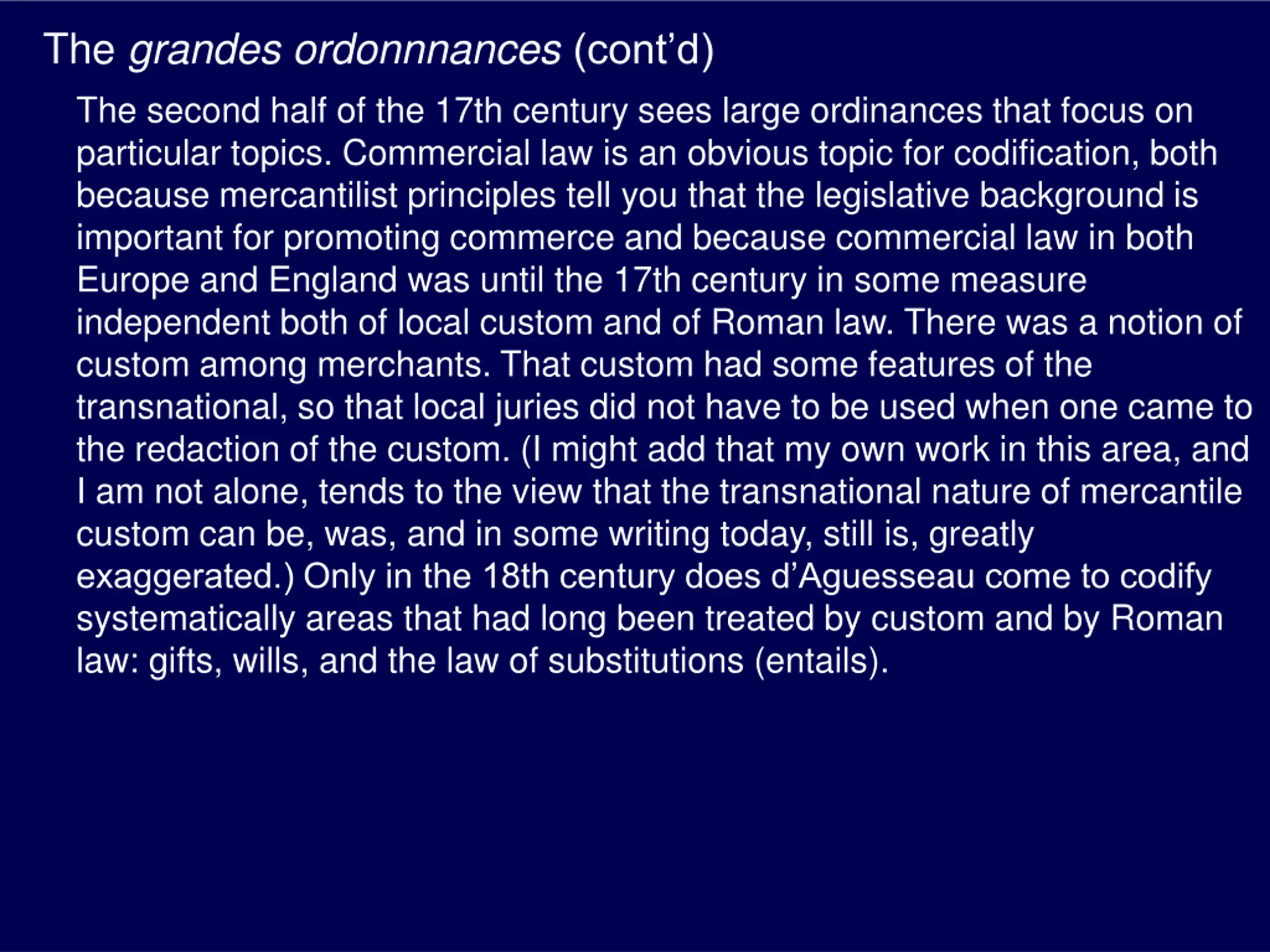 The grandes ordonnnances(contd) The second half of the 17th century sees large ordinances that focus on particular topics. Commercial law is an obvious topic for codification, both because mercantilist principles tell you that the legislative background is important for promoting commerce and because commercial law in both Europe and England was until the 17th century in some measure independent both of local custom and of Roman law. There was a notion of custom among merchants. That custom had some features of the transnational, so that local juries did not have to be used when one came to the redaction of the custom. (I might add that my own work in this area, and I am not alone, tends to the view that the transnational nature of mercantile custom can be, was, and in some writing today, still is, greatly exaggerated.) Only in the 18th century does d Aguesseau come to codify systematically areas that had long been treated by custom and by Roman law: gifts, wills, and the law of substitutions (entails).