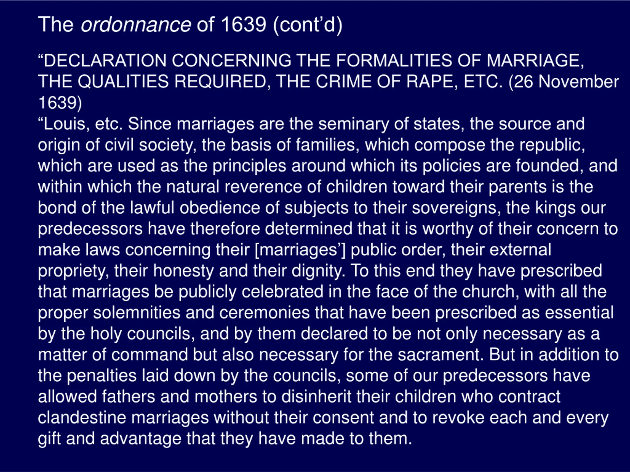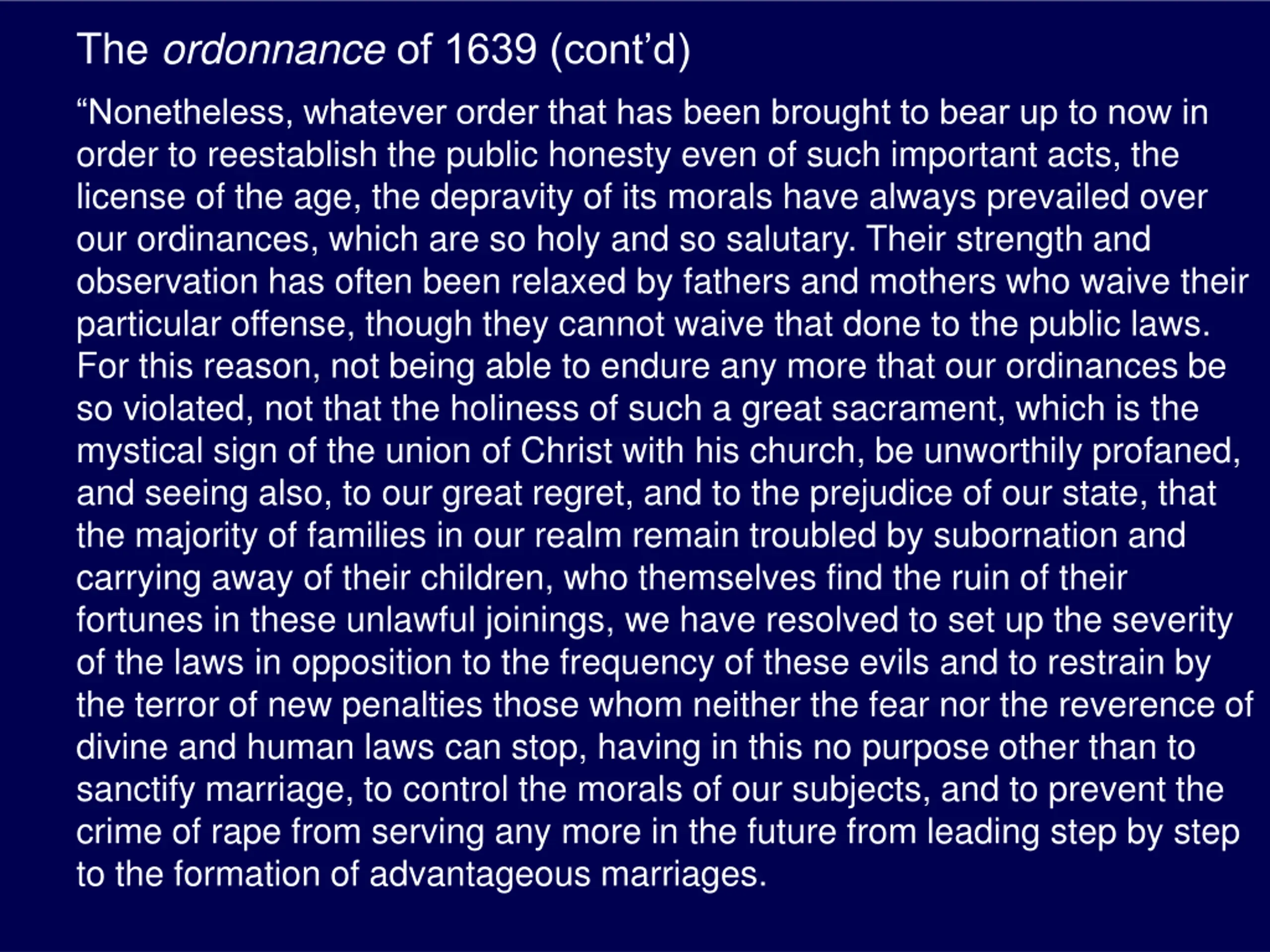 The ordonnanceof 1639 (contd) Nonetheless, whatever order that has been brought to bear up to now in order to reestablish the public honesty even of such important acts, the license of the age, the depravity of its morals have always prevailed over our ordinances, which are so holy and so salutary. Their strength and observation has often been relaxed by fathers and mothers who waive their particular offense, though they cannot waive that done to the public laws. For this reason, not being able to endure any more that our ordinances be so violated, not that the holiness of such a great sacrament, which is the mystical sign of the union of Christ with his church, be unworthily profaned, and seeing also, to our great regret, and to the prejudice of our state, that the majority of families in our realm remain troubled by subornation and carrying away of their children, who themselves find the ruin of their fortunes in these unlawful joinings, we have resolved to set up the severity of the laws in opposition to the frequency of these evils and to restrain by the terror of new penalties those whom neither the fear nor the reverence of divine and human laws can stop, having in this no purpose other than to sanctify marriage, to control the morals of our subjects, and to prevent the crime of rape from serving any more in the future from leading step by step to the formation of advantageous marriages.