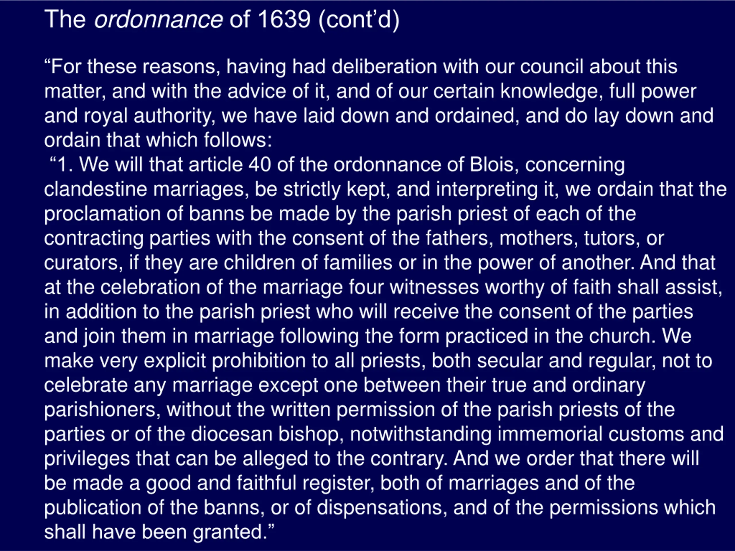 The ordonnanceof 1639 (contd) For these reasons, having had deliberation with our council about this matter, and with the advice of it, and of our certain knowledge, full power and royal authority, we have laid down and ordained, and do lay down and ordain that which follows: 1. We will that article 40 of the ordonnance of Blois, concerning clandestine marriages, be strictly kept, and interpreting it, we ordain that the proclamation of banns be made by the parish priest of each of the contracting parties with the consent of the fathers, mothers, tutors, or curators, if they are children of families or in the power of another. And that at the celebration of the marriage four witnesses worthy of faith shall assist, in addition to the parish priest who will receive the consent of the parties and join them in marriage following the form practiced in the church. We make very explicit prohibition to all priests, both secular and regular, not to celebrate any marriage except one between their true and ordinary parishioners, without the written permission of the parish priests of the parties or of the diocesan bishop, notwithstanding immemorial customs and privileges that can be alleged to the contrary. And we order that there will be made a good and faithful register, both of marriages and of the publication of the banns, or of dispensations, and of the permissions which shall have been granted.