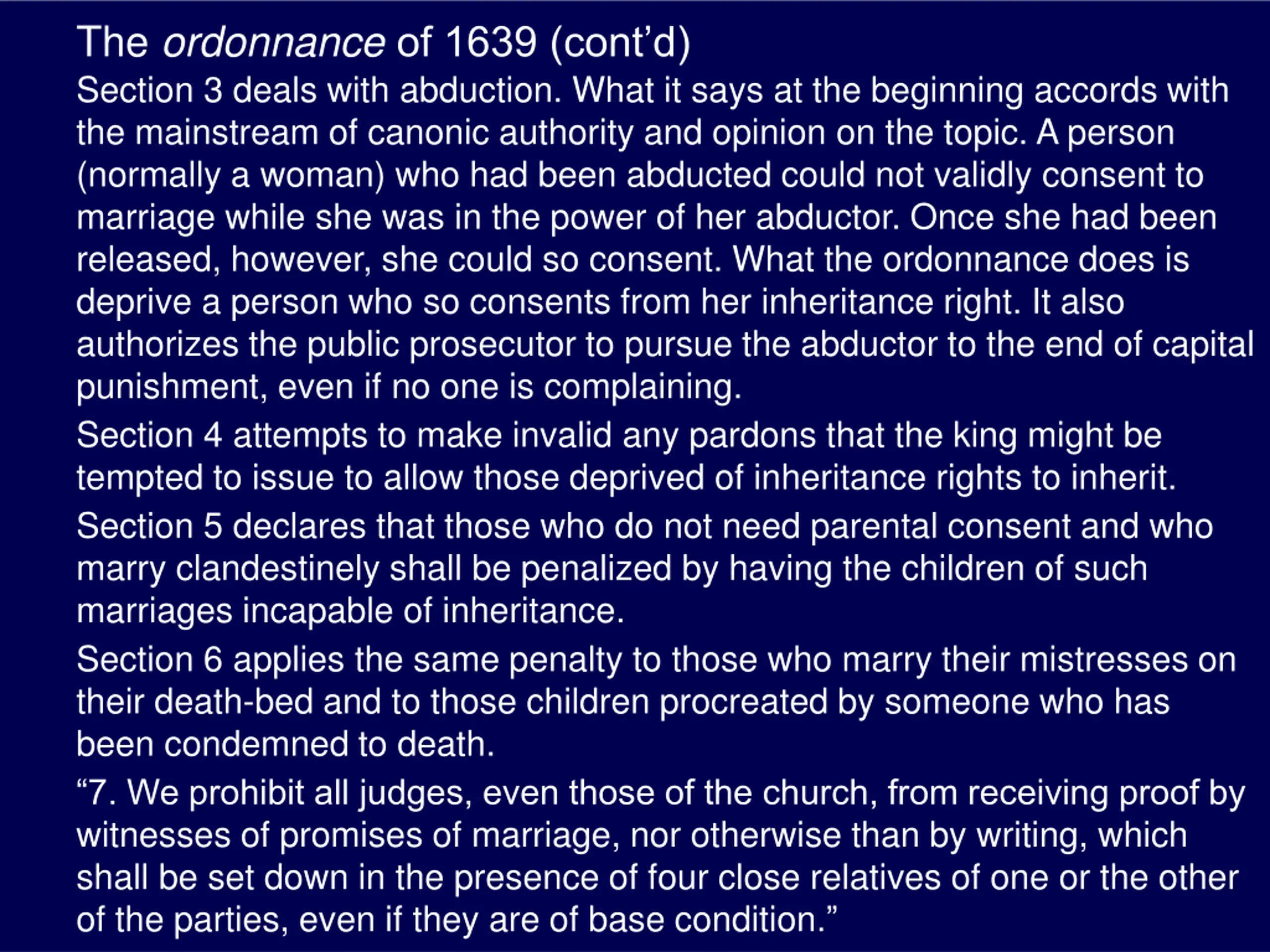 The ordonnanceof 1639 (contd) Section 3 deals with abduction. What it says at the beginning accords with the mainstream of canonic authority and opinion on the topic. A person (normally a woman) who had been abducted could not validly consent to marriage while she was in the power of her abductor. Once she had been released, however, she could so consent. What the ordonnance does is deprive a person who so consents from her inheritance right. It also authorizes the public prosecutor to pursue the abductor to the end of capital punishment, even if no one is complaining. Section 4 attempts to make invalid any pardons that the king might be tempted to issue to allow those deprived of inheritance rights to inherit. Section 5 declares that those who do not need parental consent and who marry clandestinely shall be penalized by having the children of such marriages incapable of inheritance. Section 6 applies the same penalty to those who marry their mistresses on their death-bed and to those children procreated by someone who has been condemned to death. 7. We prohibit all judges, even those of the church, from receiving proof by witnesses of promises of marriage, nor otherwise than by writing, which shall be set down in the presence of four close relatives of one or the other of the parties, even if they are of base condition.