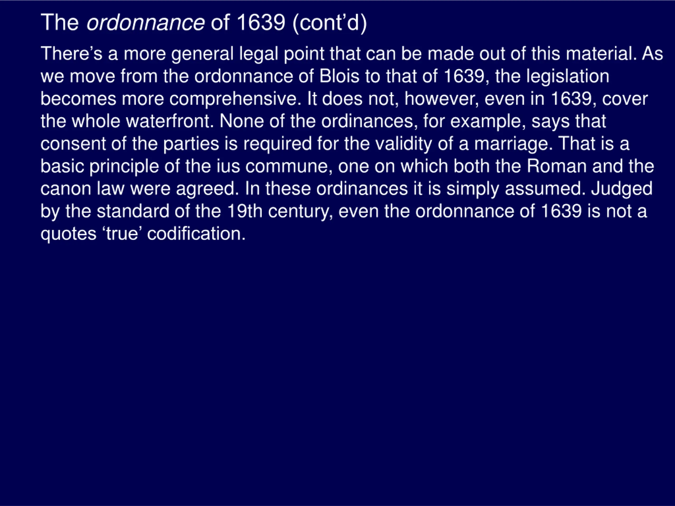 The ordonnanceof 1639 (contd) There s a more general legal point that can be made out of this material. As we move from the ordonnance of Blois to that of 1639, the legislation becomes more comprehensive. It does not, however, even in 1639, cover the whole waterfront. None of the ordinances, for example, says that consent of the parties is required for the validity of a marriage. That is a basic principle of the ius commune, one on which both the Roman and the canon law were agreed. In these ordinances it is simply assumed. Judged by the standard of the 19th century, even the ordonnance of 1639 is not a quotes true codification.