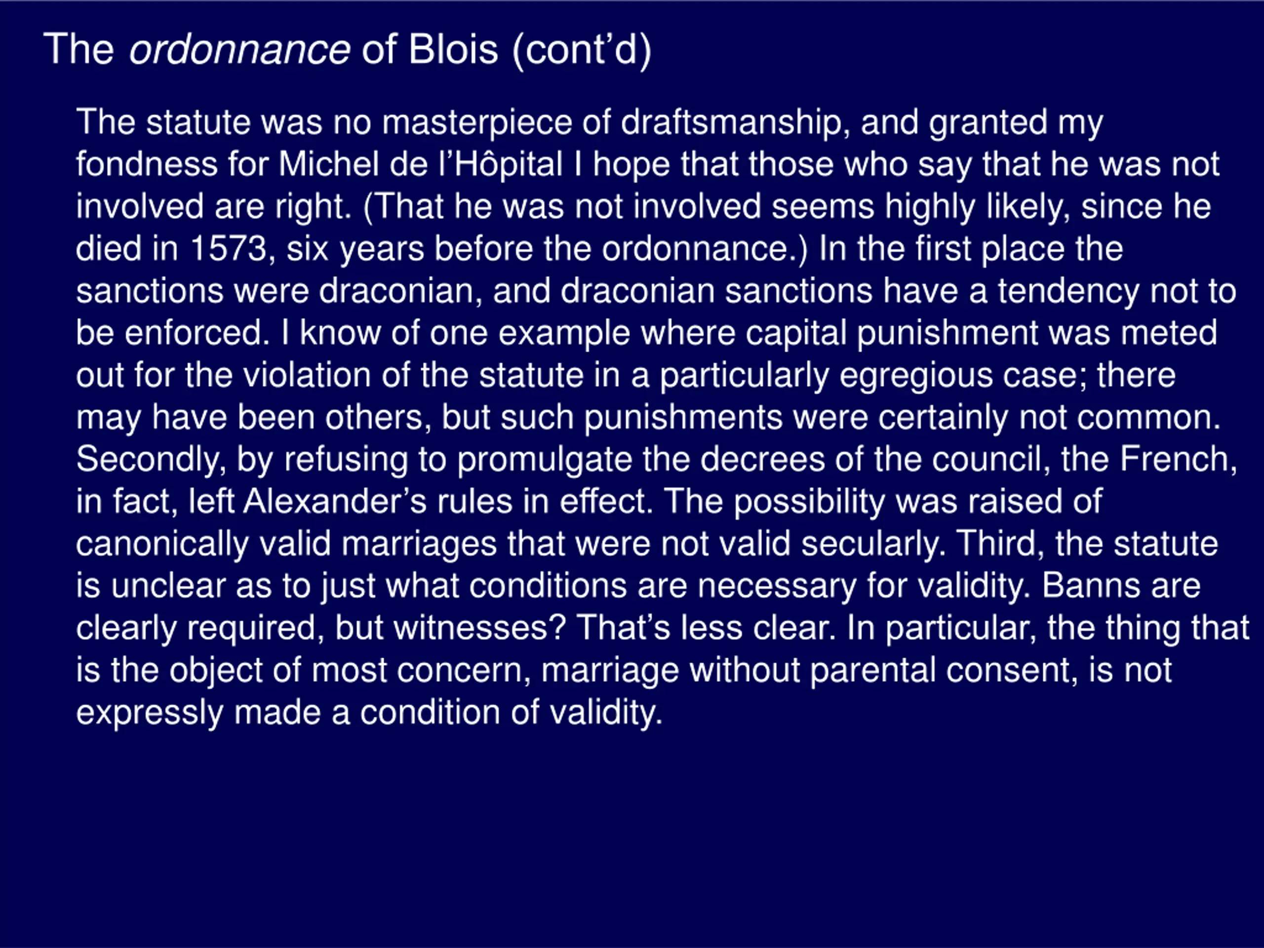 The ordonnanceof Blois (contd) The statute was no masterpiece of draftsmanship, and granted my fondness for Michel de l H pital I hope that those who say that he was not involved are right. (That he was not involved seems highly likely, since he died in 1573, six years before the ordonnance.) In the first place the sanctions were draconian, and draconian sanctions have a tendency not to be enforced. I know of one example where capital punishment was meted out for the violation of the statute in a particularly egregious case; there may have been others, but such punishments were certainly not common. Secondly, by refusing to promulgate the decrees of the council, the French, in fact, left Alexander s rules in effect. The possibility was raised of canonically valid marriages that were not valid secularly. Third, the statute is unclear as to just what conditions are necessary for validity. Banns are clearly required, but witnesses? That s less clear. In particular, the thing that is the object of most concern, marriage without parental consent, is not expressly made a condition of validity.