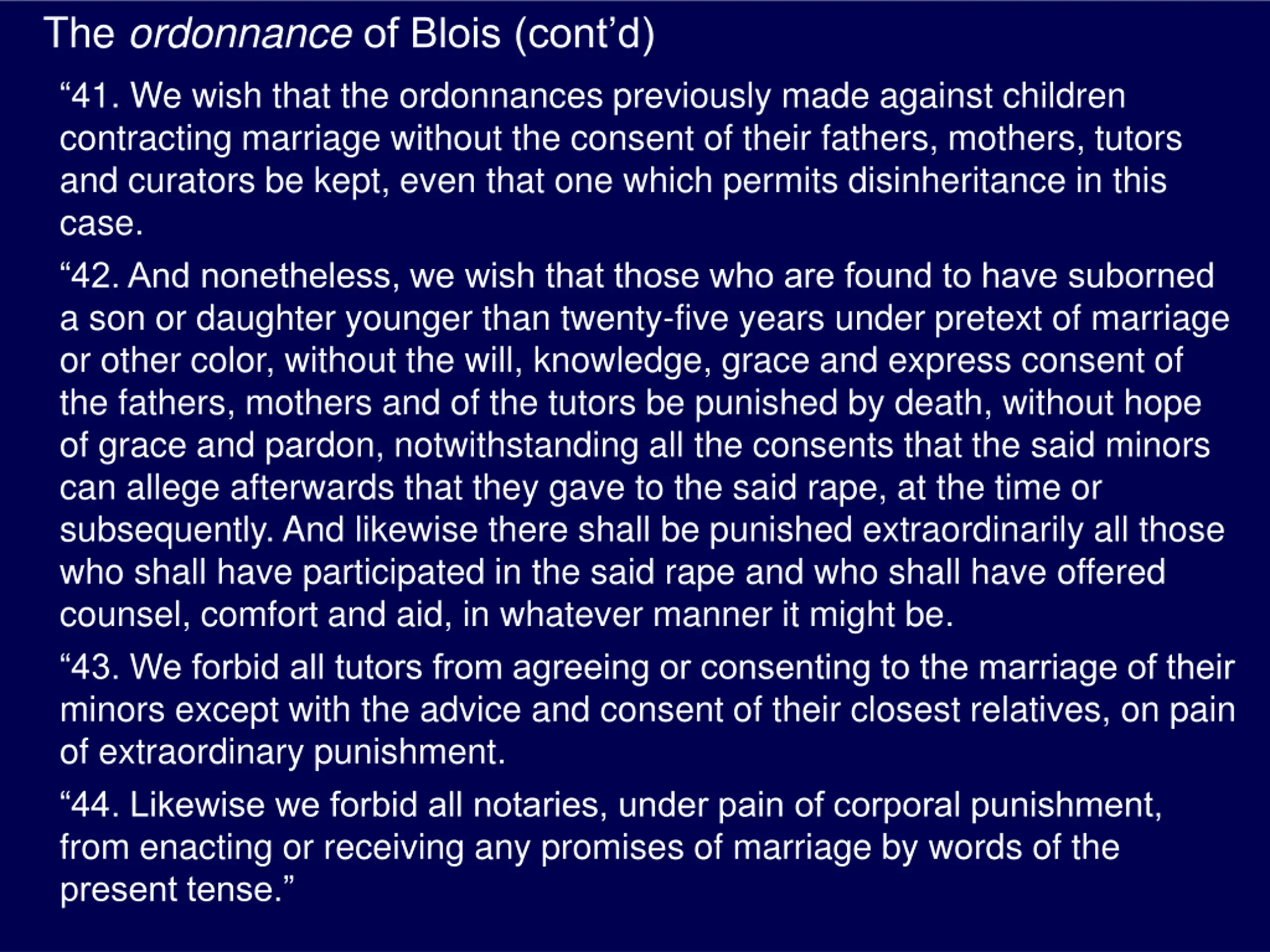 The ordonnanceof Blois (contd) 41. We wish that the ordonnances previously made against children contracting marriage without the consent of their fathers, mothers, tutors and curators be kept, even that one which permits disinheritance in this case. 42. And nonetheless, we wish that those who are found to have suborned a son or daughter younger than twenty-five years under pretext of marriage or other color, without the will, knowledge, grace and express consent of the fathers, mothers and of the tutors be punished by death, without hope of grace and pardon, notwithstanding all the consents that the said minors can allege afterwards that they gave to the said rape, at the time or subsequently. And likewise there shall be punished extraordinarily all those who shall have participated in the said rape and who shall have offered counsel, comfort and aid, in whatever manner it might be. 43. We forbid all tutors from agreeing or consenting to the marriage of their minors except with the advice and consent of their closest relatives, on pain of extraordinary punishment. 44. Likewise we forbid all notaries, under pain of corporal punishment, from enacting or receiving any promises of marriage by words of the present tense.