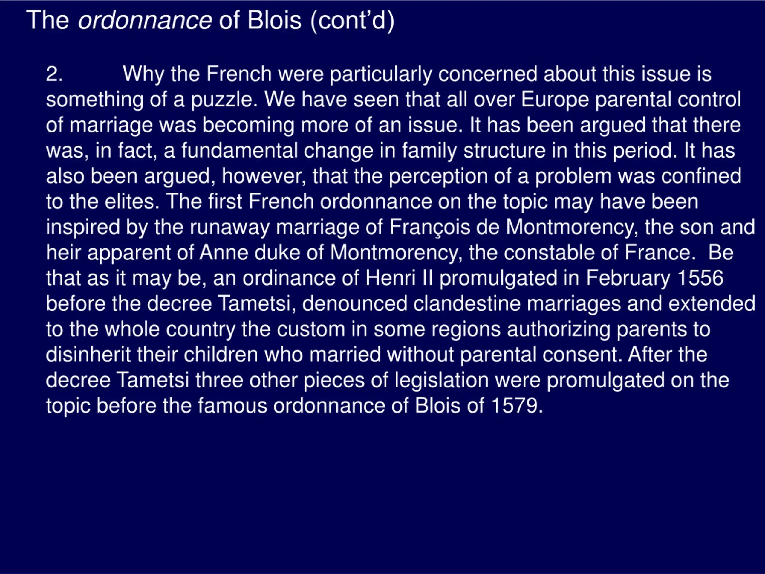 The ordonnance of Blois (contd) 2. something of a puzzle. We have seen that all over Europe parental control of marriage was becoming more of an issue. It has been argued that there was, in fact, a fundamental change in family structure in this period. It has also been argued, however, that the perception of a problem was confined to the elites. The first French ordonnance on the topic may have been inspired by the runaway marriage of Fran ois de Montmorency, the son and heir apparent of Anne duke of Montmorency, the constable of France. Be that as it may be, an ordinance of Henri II promulgated in February 1556 before the decree Tametsi, denounced clandestine marriages and extended to the whole country the custom in some regions authorizing parents to disinherit their children who married without parental consent. After the decree Tametsi three other pieces of legislation were promulgated on the topic before the famous ordonnance of Blois of 1579. Why the French were particularly concerned about this issue is