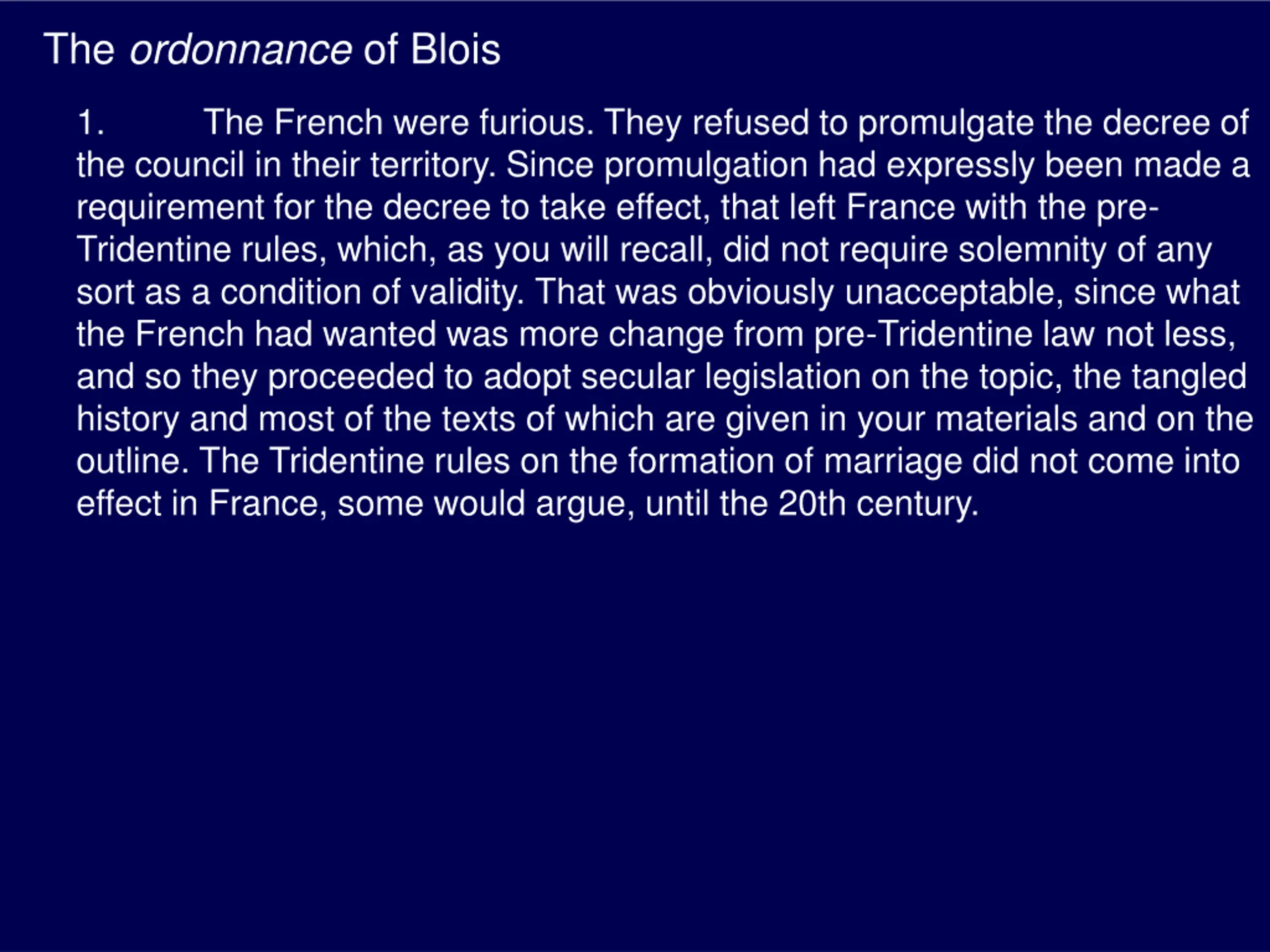 The ordonnance of Blois 1. the council in their territory. Since promulgation had expressly been made a requirement for the decree to take effect, that left France with the pre- Tridentine rules, which, as you will recall, did not require solemnity of any sort as a condition of validity. That was obviously unacceptable, since what the French had wanted was more change from pre-Tridentine law not less, and so they proceeded to adopt secular legislation on the topic, the tangled history and most of the texts of which are given in your materials and on the outline. The Tridentine rules on the formation of marriage did not come into effect in France, some would argue, until the 20th century. The French were furious. They refused to promulgate the decree of