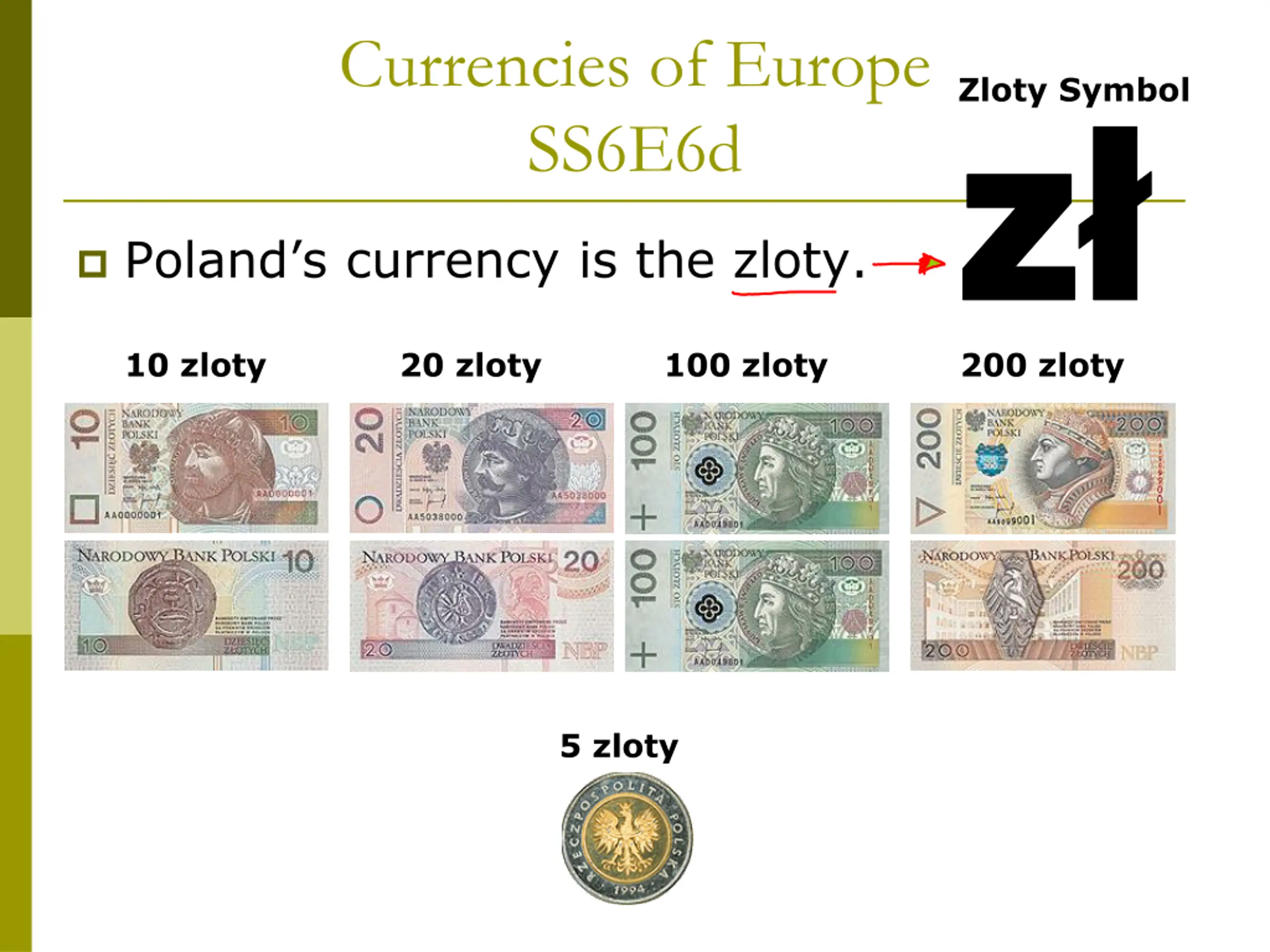 Currencies of Europe SS6E6d Zloty Symbol z Poland s currency is the zloty. 10 zloty 20 zloty 100 zloty 200 zloty 5 zloty