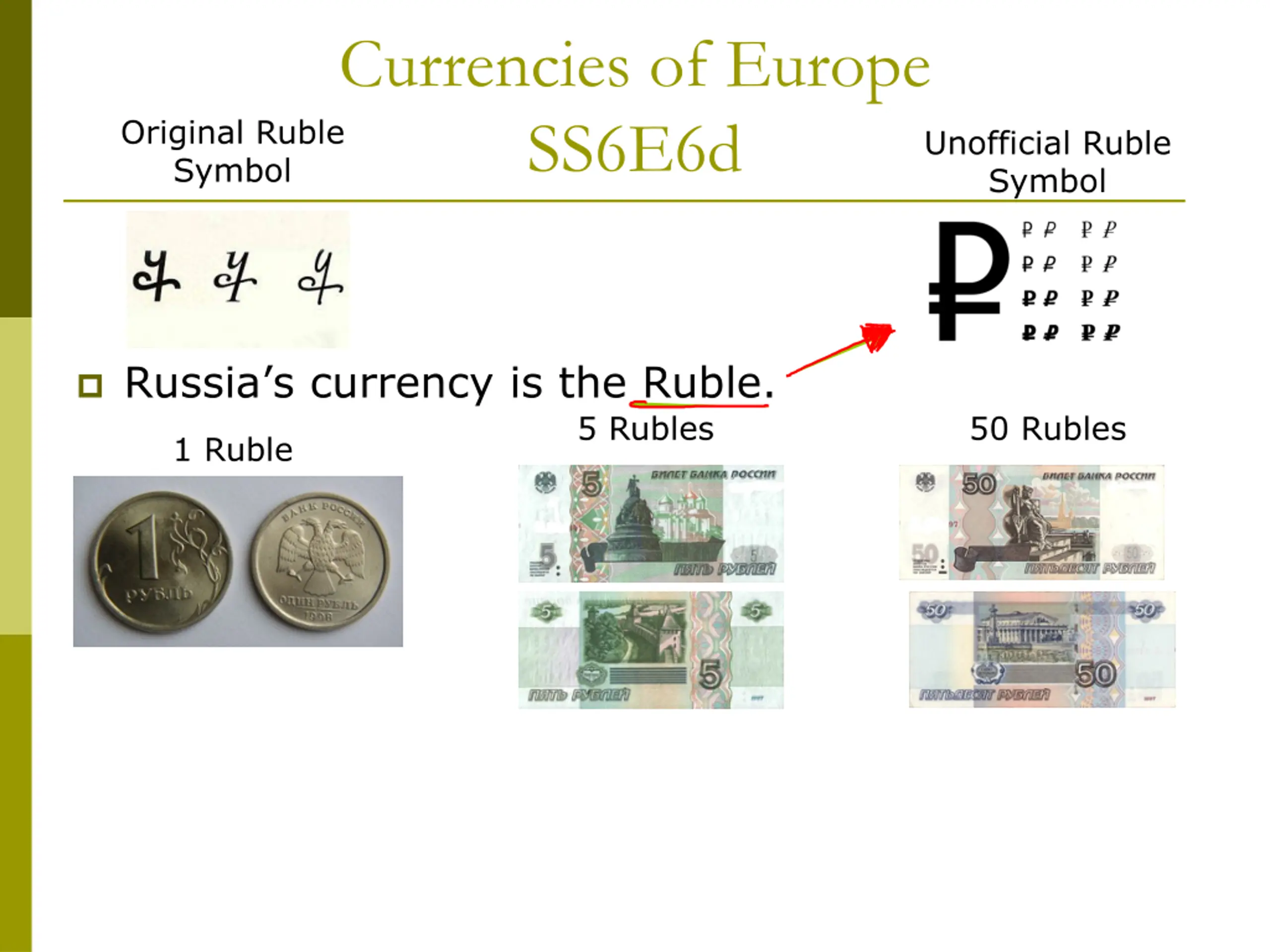 Currencies of Europe SS6E6d Original Ruble Symbol Unofficial Ruble Symbol Image:Rouble-signs.gif Russia s currency is the Ruble. 5 Rubles 50 Rubles 1 Ruble